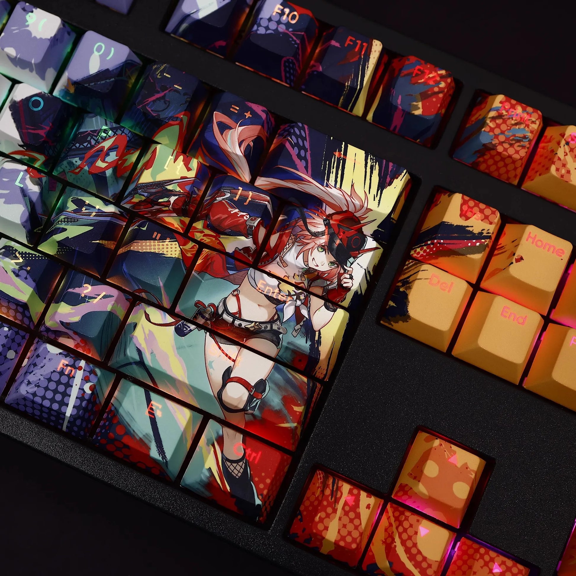 This mechanical keycaps set features various prints of Rappa from the Game "Honkai" that are bound together with yellow, red and white colouring, combined with Backlit keycaps, Rappa illuminates when LEDs pass through the keycaps.
