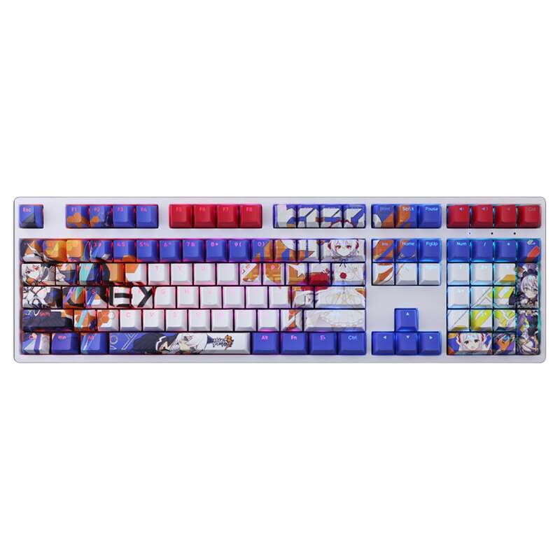 This mechanical keycaps set features various prints of Theresa Apocalypse from the Game "Honkai" that are bound together with white, blue and red colouring, combined with Backlit keycaps, Theresa Apocalypse illuminates when LEDs pass through the keycaps.