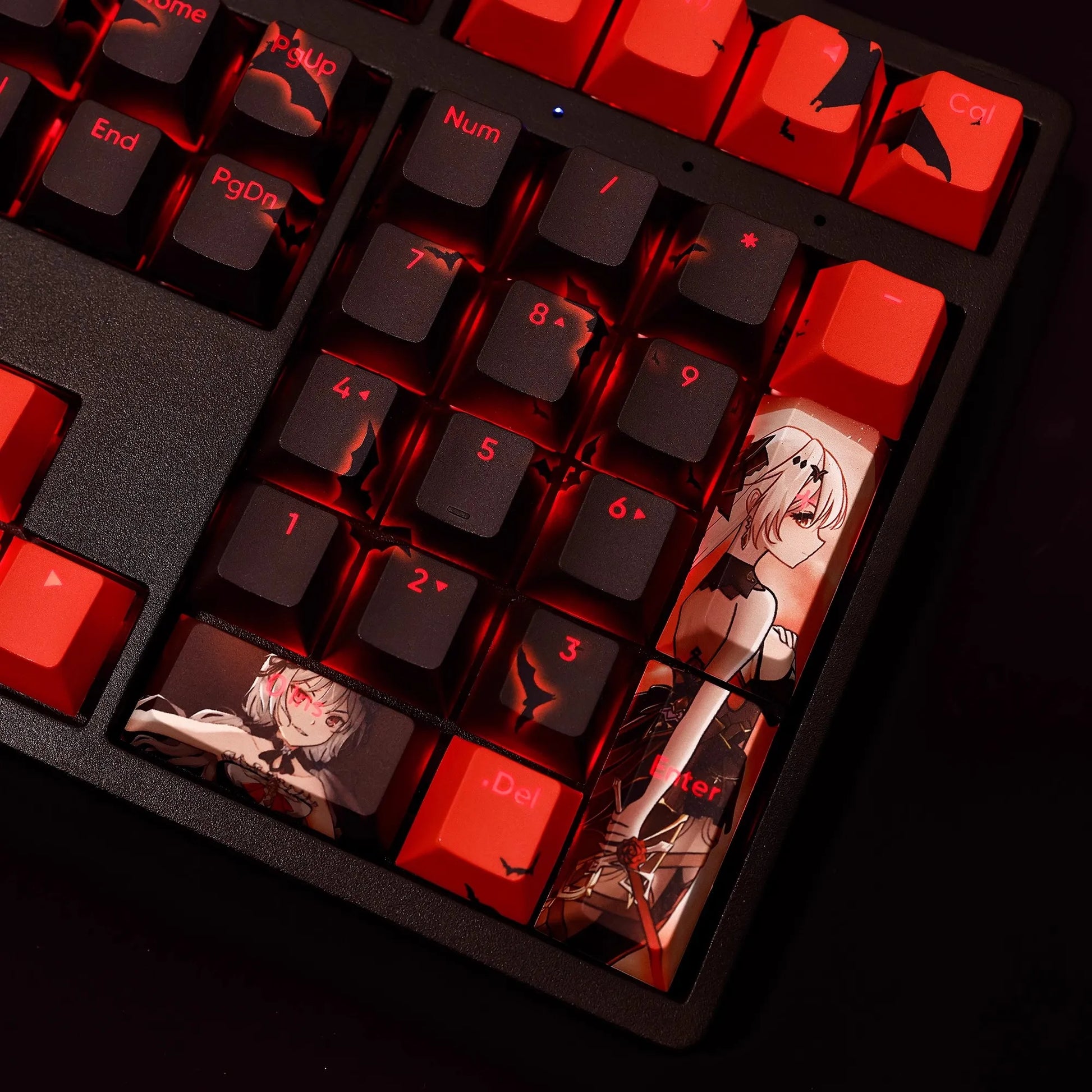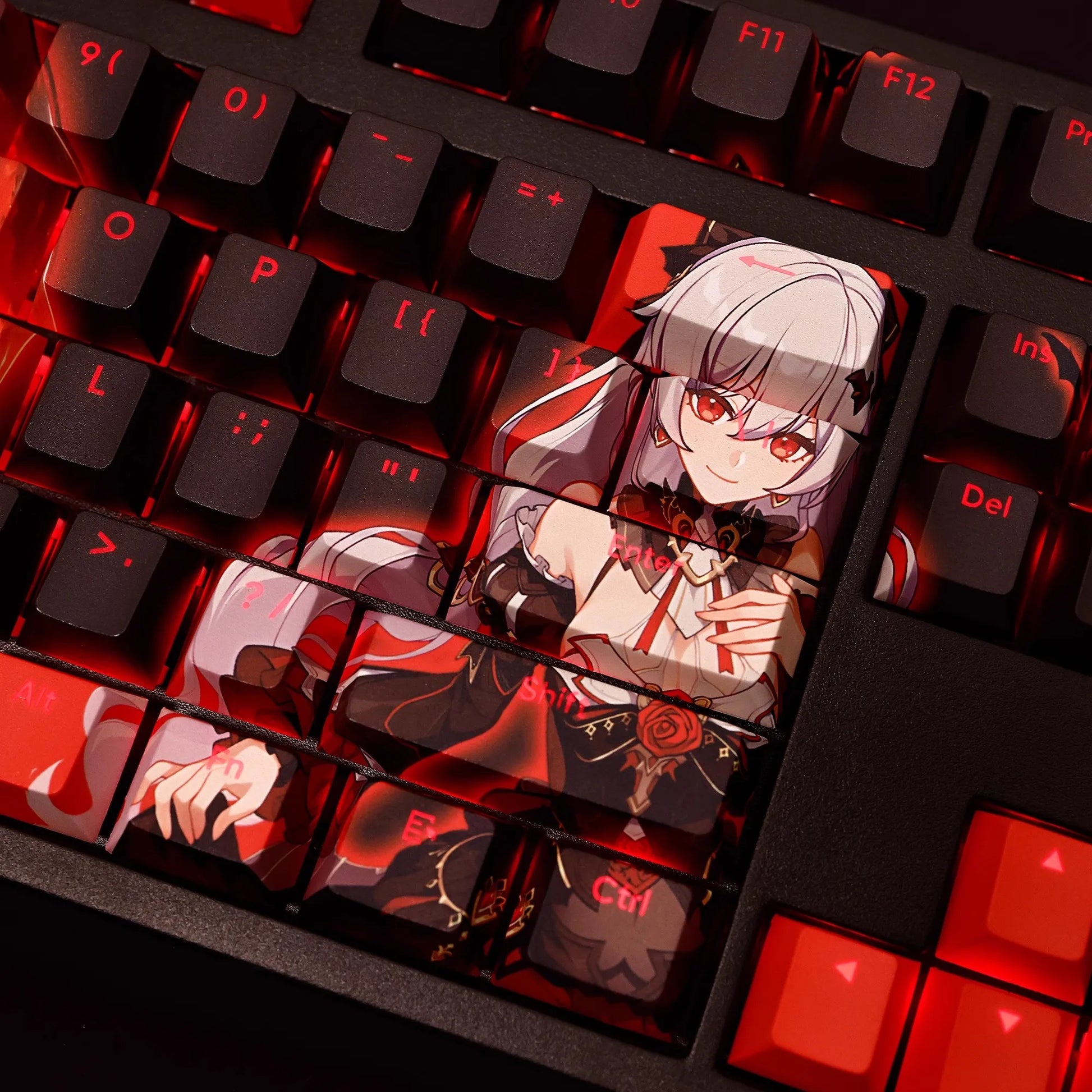 This mechanical keycaps set features various prints of Theresa from the Game "Honkai" that are bound together with red and black colouring, combined with Backlit keycaps, Theresa illuminates when LEDs pass through the keycaps.