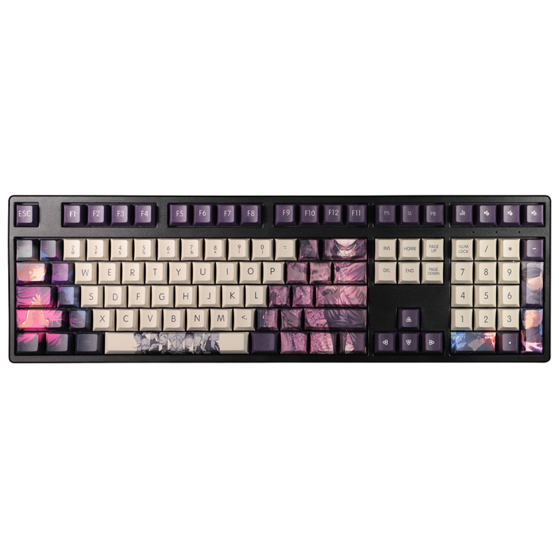 This mechanical keycaps set features various prints of Satoru Gojo from the anime "Jujutsu Kaisen" that are bound together with purple and cream blue colouring.