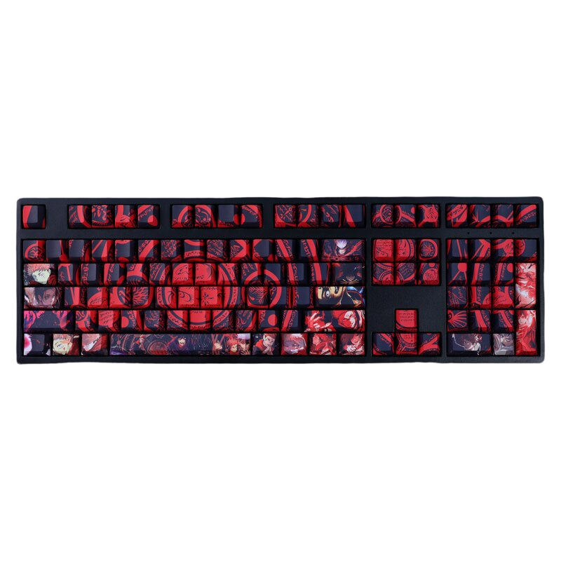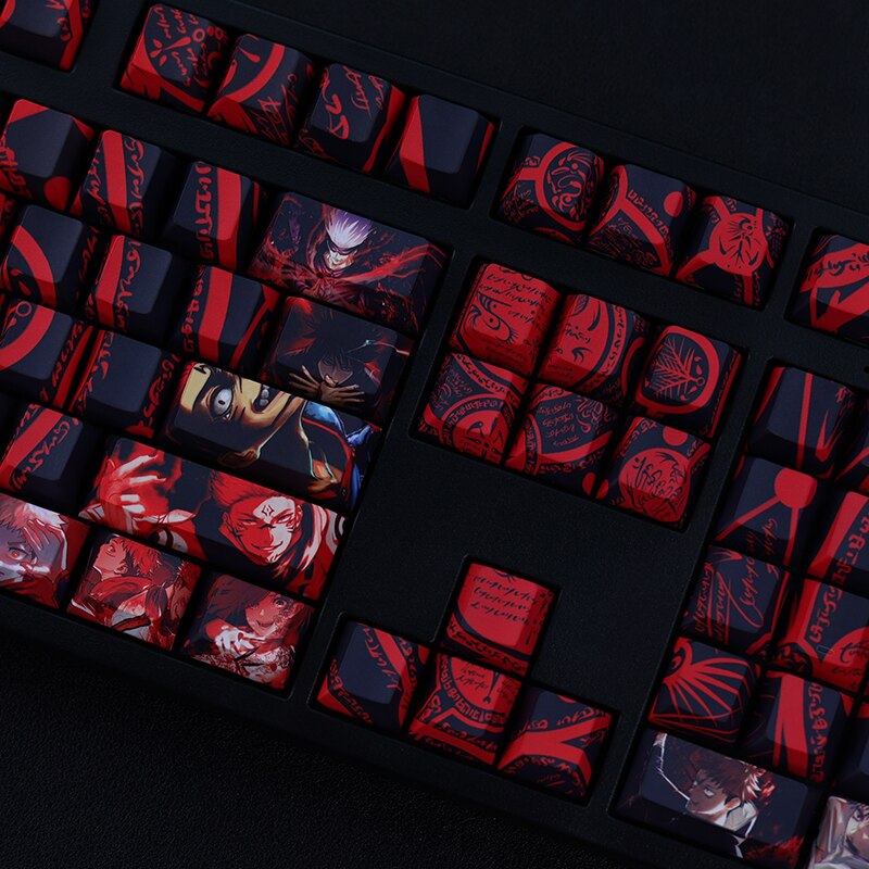 This mechanical keycaps set features various prints of Yuji itadori from the anime "Jujutsu Kaisen" that are bound together with red and dark blue colouring.