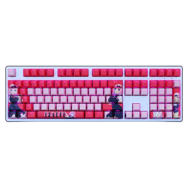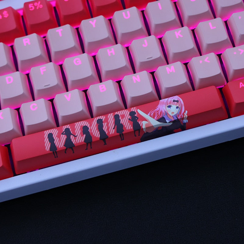 This mechanical keycaps set features various prints of Chika Fujiwara from the anime "Kaguya-sama" that are bound together with pink colouring, combined with Backlit keycaps, Chika Fujiwara illuminates when LEDs pass through the keycaps.