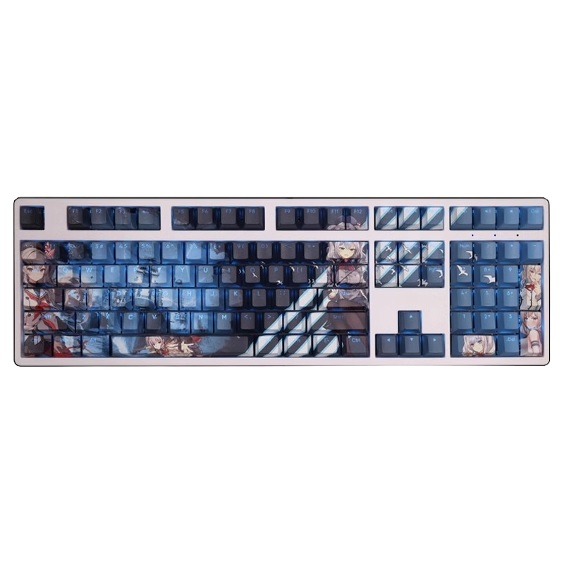 This mechanical keycaps set features various prints of Kashima from the anime "KanColle" that are bound together with white and light purple colouring, combined with Backlit keycaps, Kashima illuminates when LEDs pass through the keycaps.