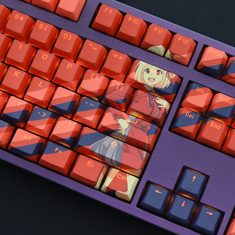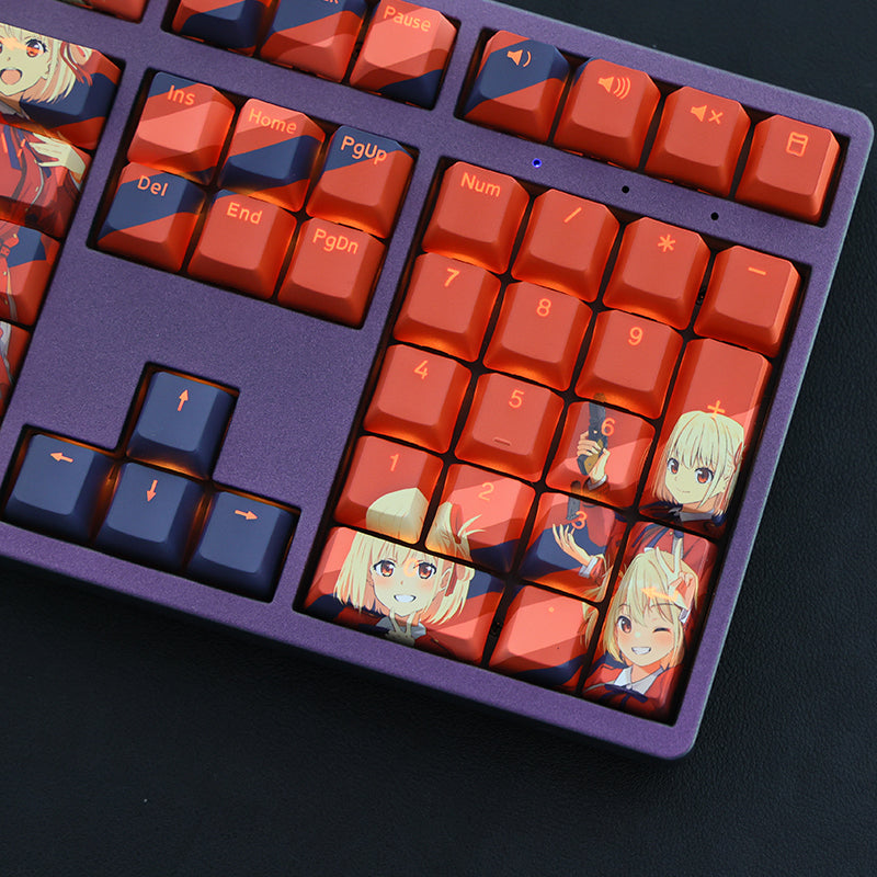 This mechanical keycaps set features various prints of Chisato Nishikigi from the anime "Lycoris Recoil" that are bound together with red colouring, combined with Backlit keycaps, Chisato Nishikigi illuminates when LEDs pass through the keycaps.