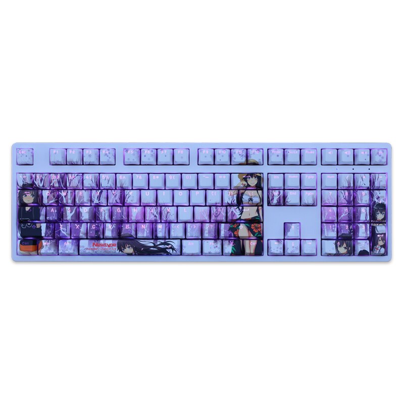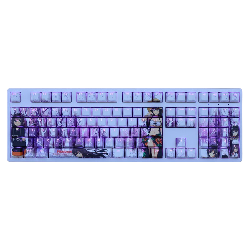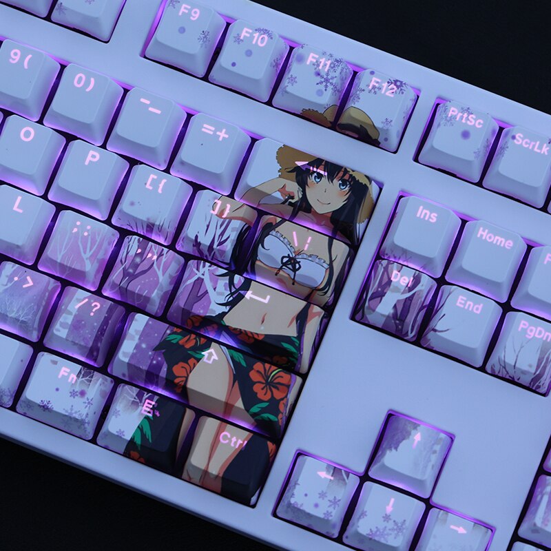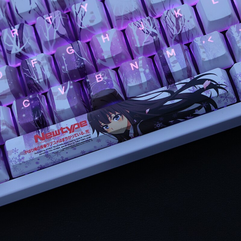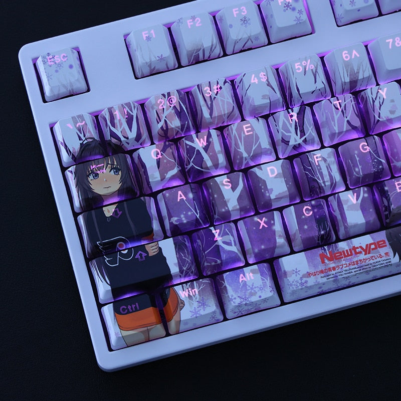 This mechanical keycaps set features various prints of Yukino Yukinoshita from the anime "My Teen Romantic Comedy" that are bound together with blue and purple colouring, combined with Backlit keycaps, Yukino Yukinoshita illuminates when LEDs pass through the keycaps.