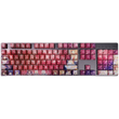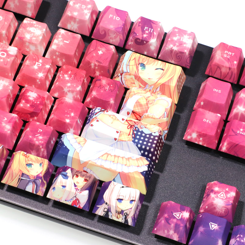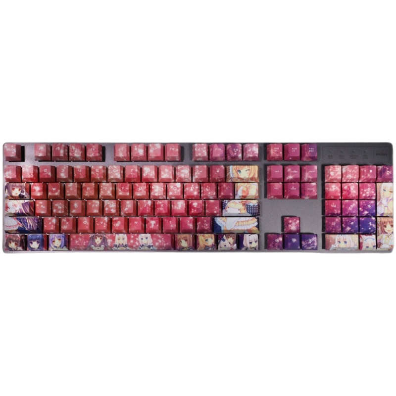 This mechanical keycaps set features various prints of characters from the anime "Nekopara" that are bound together with pink and purple colouring.