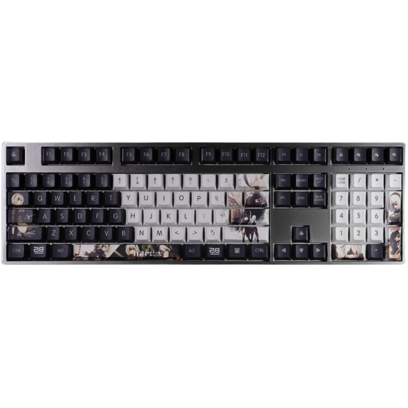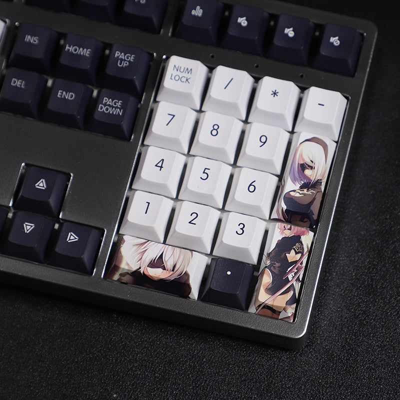 This mechanical keycaps set features various prints of 2B from the Game "NieR" that are bound together with white and black colouring.