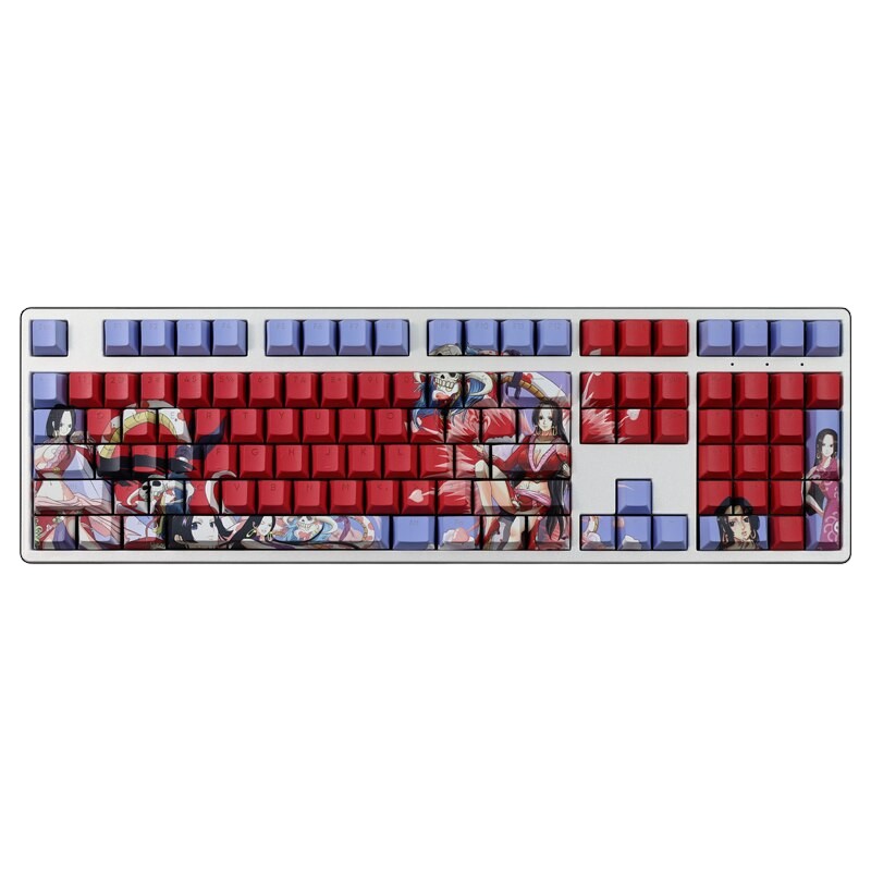 This mechanical keycaps set features various prints of Boa Hancock from the anime "One Piece" that are bound together with red and blue colouring, combined with Backlit keycaps, Boa Hancock illuminates when LEDs pass through the keycaps.