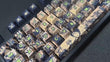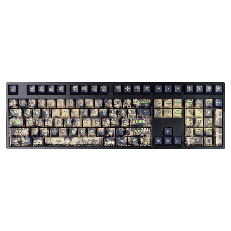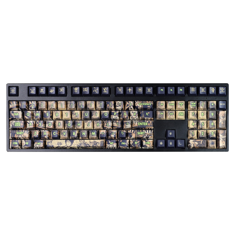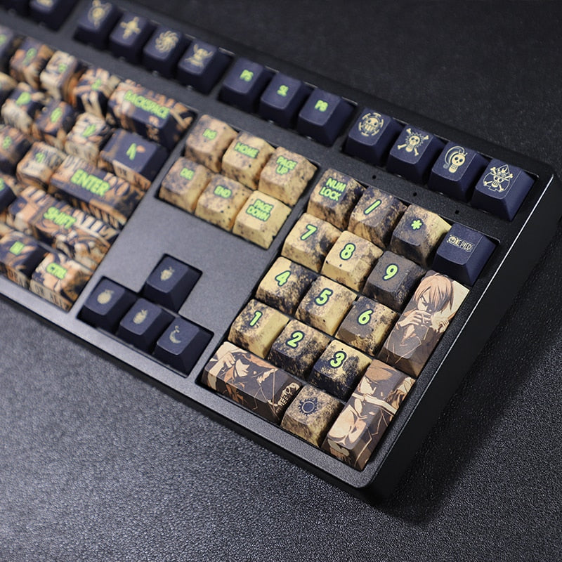 This mechanical keycaps set features various prints of characters from the anime "One Piece" that are bound together with yellow and black colouring.