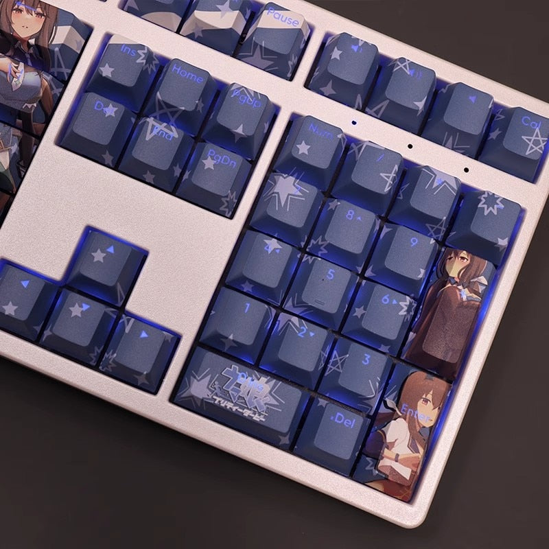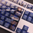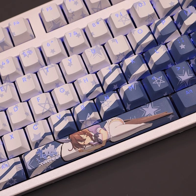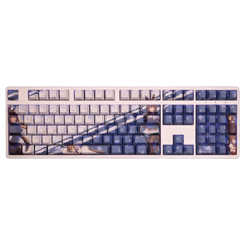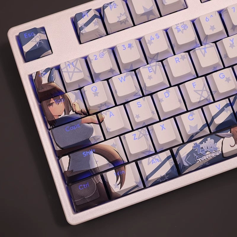 This mechanical keycaps set features various prints of Admire Vega from the anime "Pretty Derby" that are bound together with white and blue colouring, combined with Backlit keycaps, Admire Vega illuminates when LEDs pass through the keycaps.