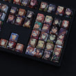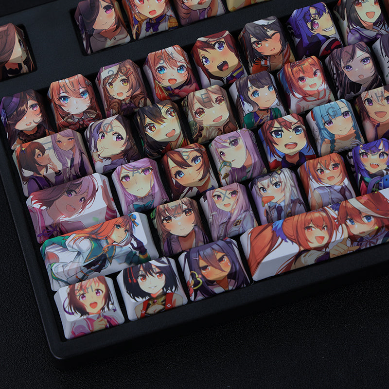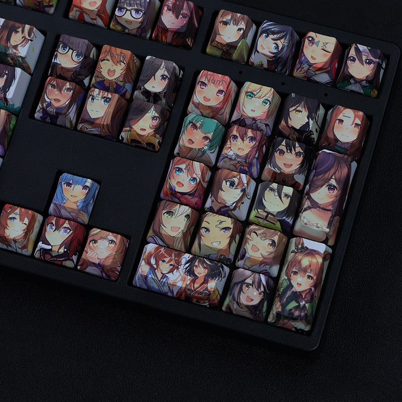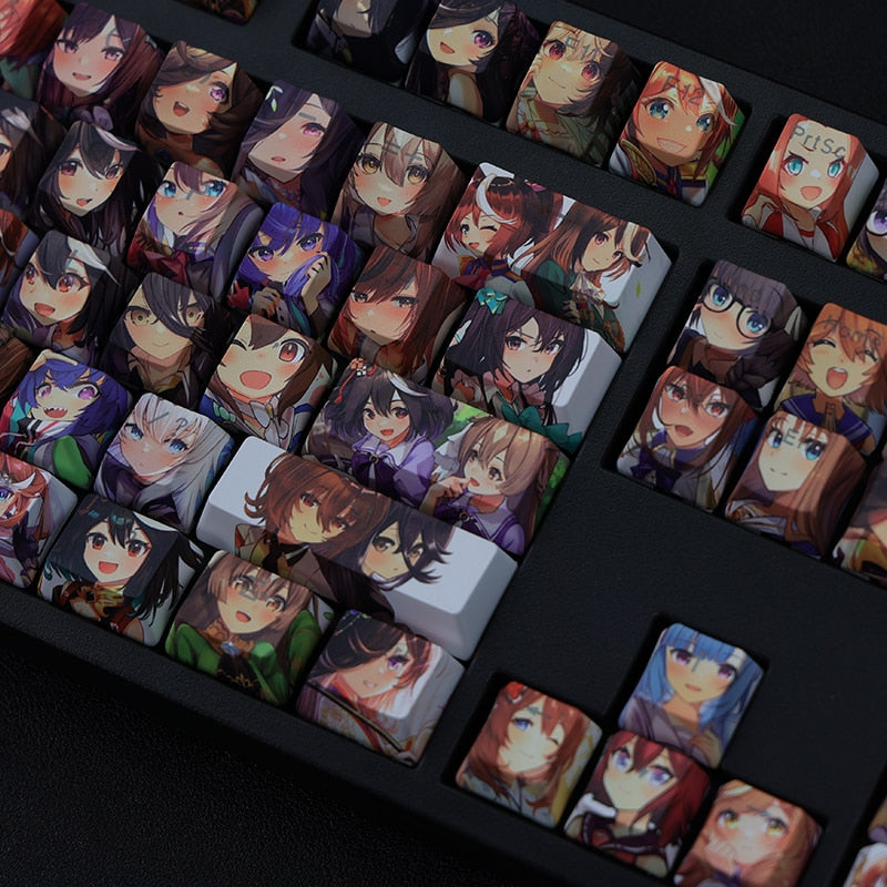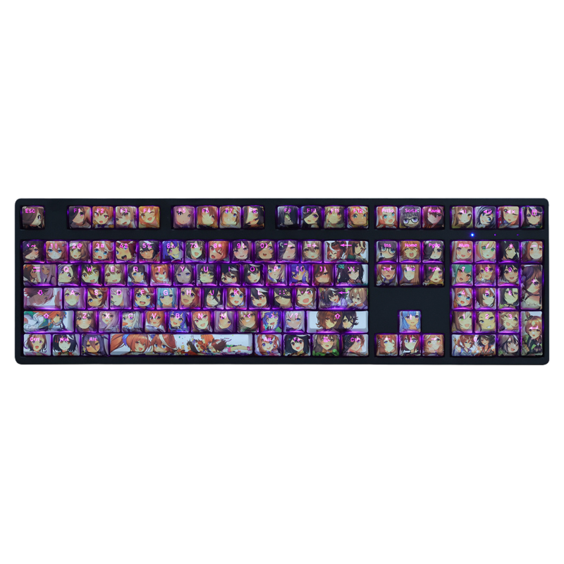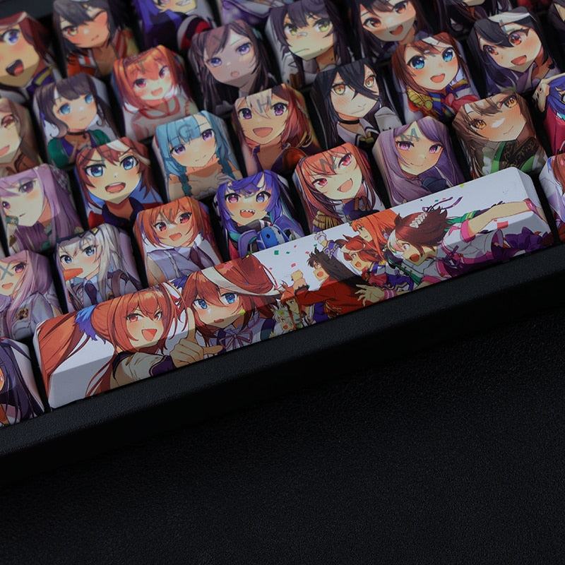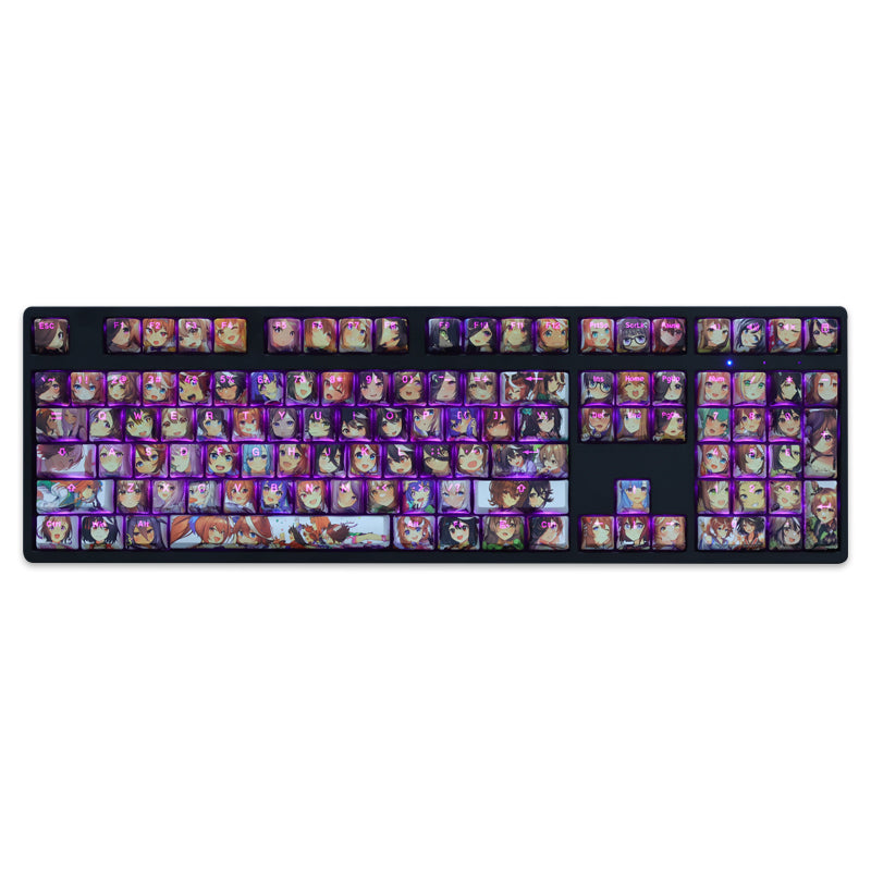 This mechanical keycaps set features various prints of characters faces from the anime "Pretty Derby", combined with Backlit keycaps, Pretty Derby faces illuminate when LEDs pass through the keycaps.