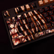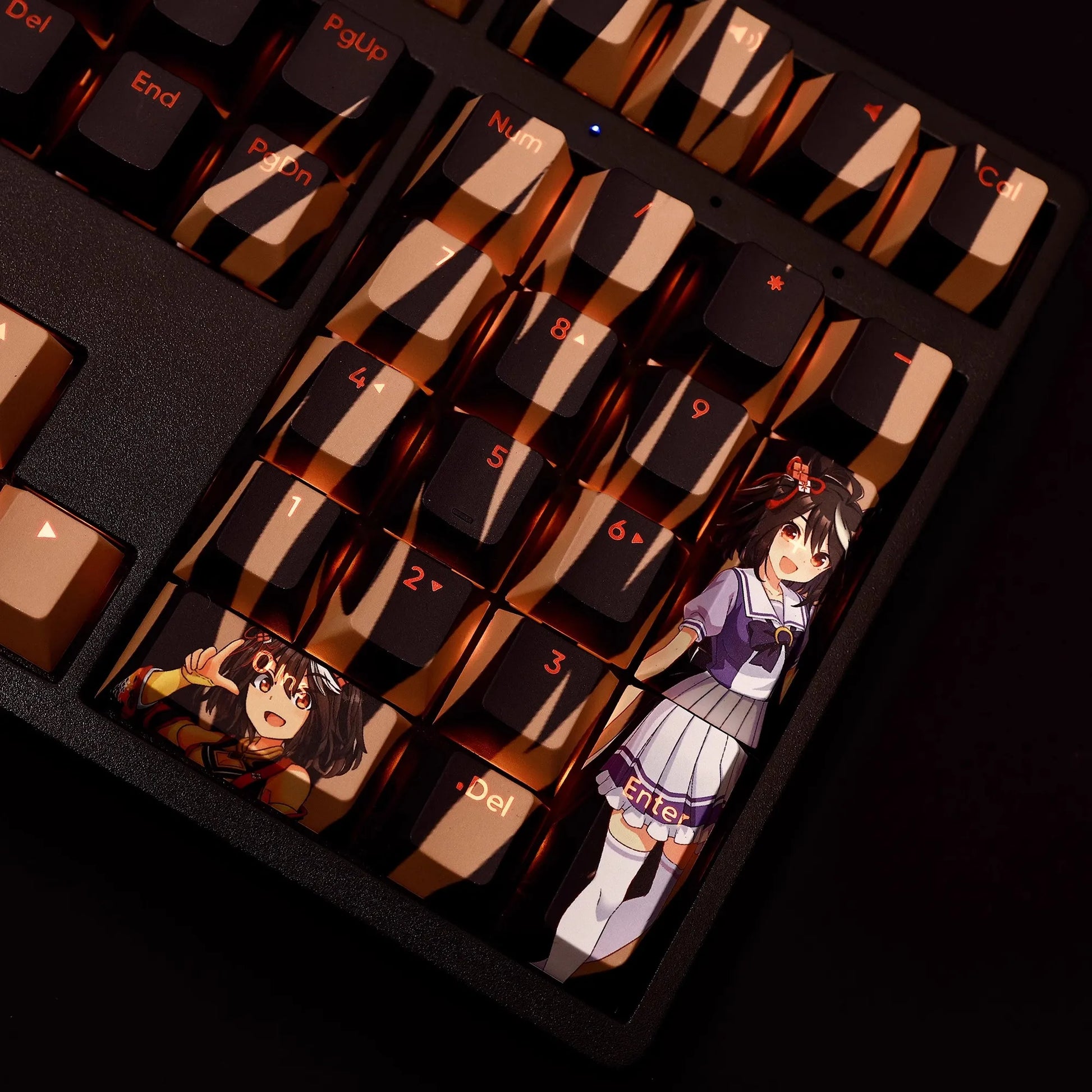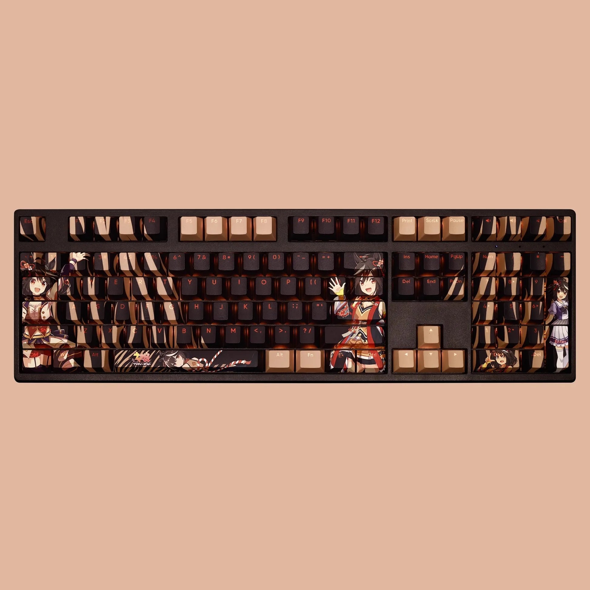 This mechanical keycaps set features various prints of Kitasan Black from the anime "Pretty Derby" that are bound together with brown and black colouring, combined with Backlit keycaps, Kitasan Black illuminates when LEDs pass through the keycaps.