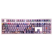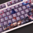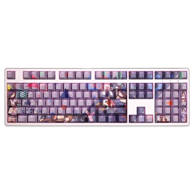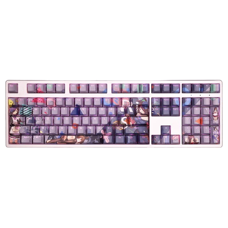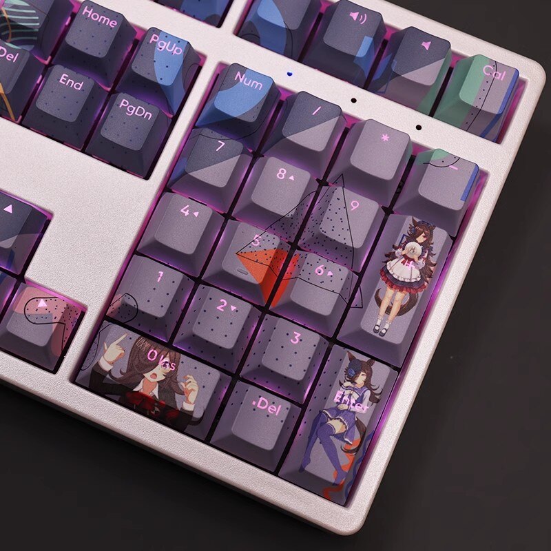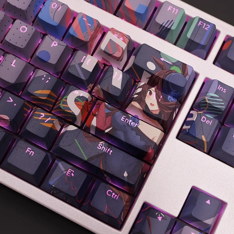 This mechanical keycaps set features various prints of Rice Shower from the anime "Pretty Derby" that are bound together with purple colouring, combined with Backlit keycaps, Rice Shower illuminates when LEDs pass through the keycaps.