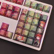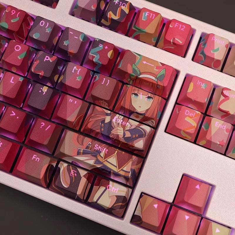 This mechanical keycaps set features various prints of Silence Suzuka from the anime "Pretty Derby" that are bound together with yellow and purple colouring, combined with Backlit keycaps, Silence Suzuka illuminates when LEDs pass through the keycaps.