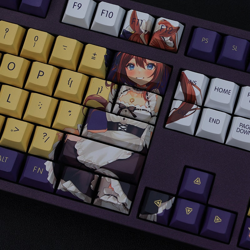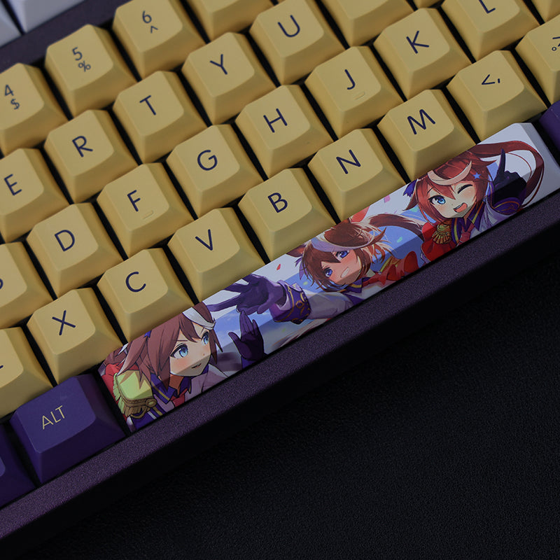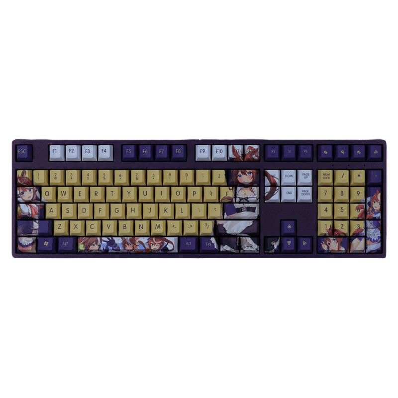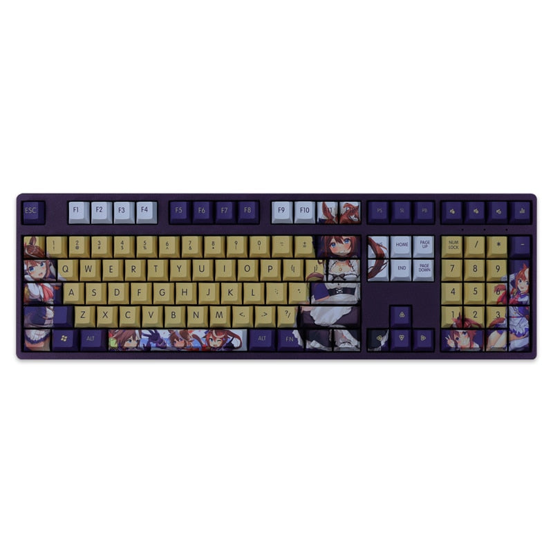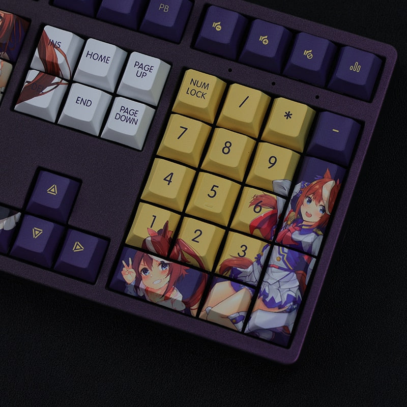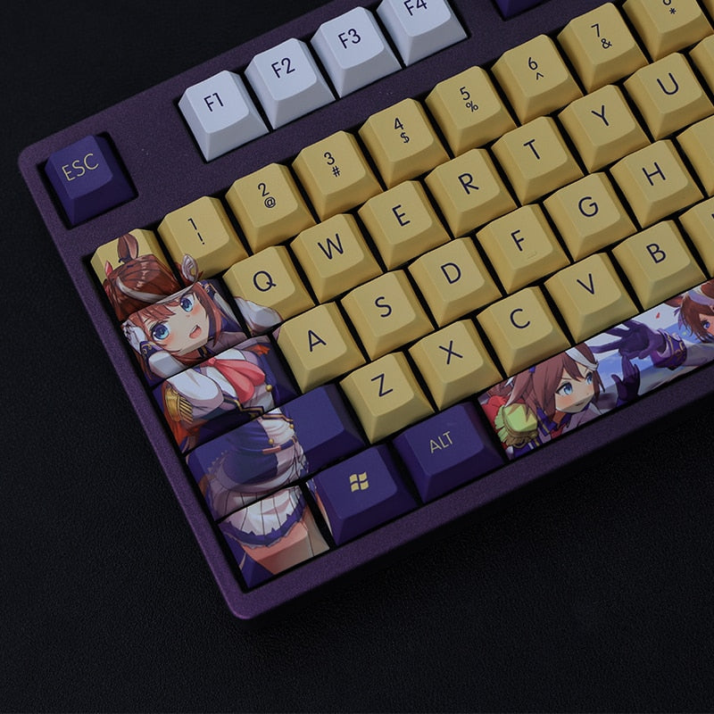 This mechanical keycaps set features various prints of Tokai Teio from the anime "Pretty Derby" that are bound together with yellow, white and purple colouring, combined with Backlit keycaps.