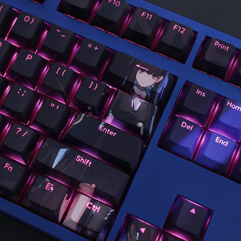This mechanical keycaps set features various prints of Selena from the Game "Punishing Gray Raven" that are bound together with purple and black colouring, combined with Backlit keycaps, Selena illuminates when LEDs pass through the keycaps.