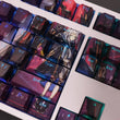 This mechanical keycaps set features various prints of Rosmontis from the mobile game "Arknights" that are bound together with rainbow colouring, combined with Backlit keycaps, Rosmontis illuminates when LEDs pass through the keycaps.