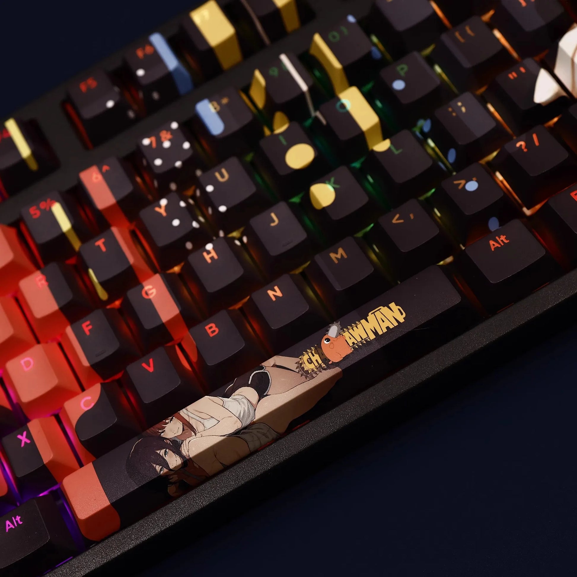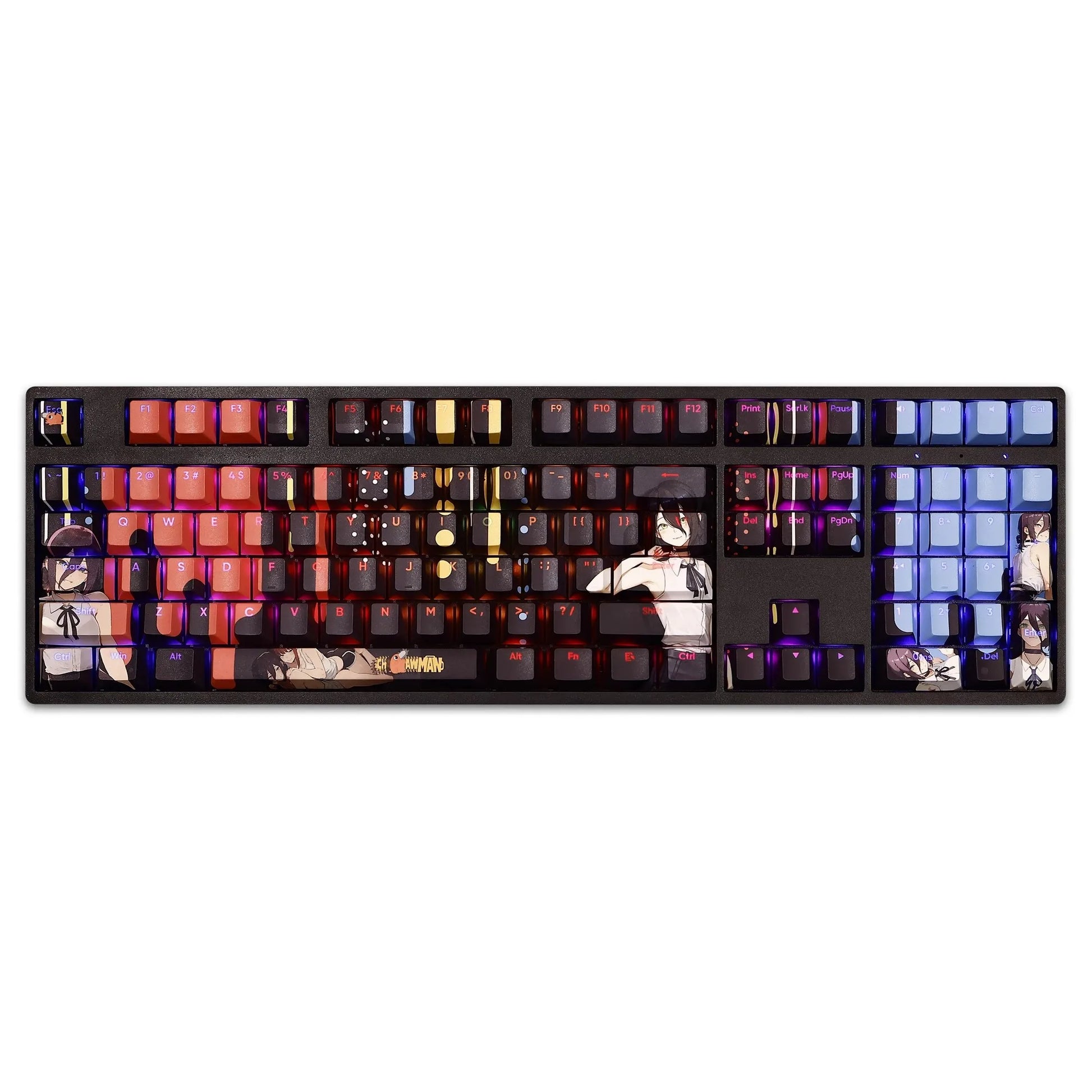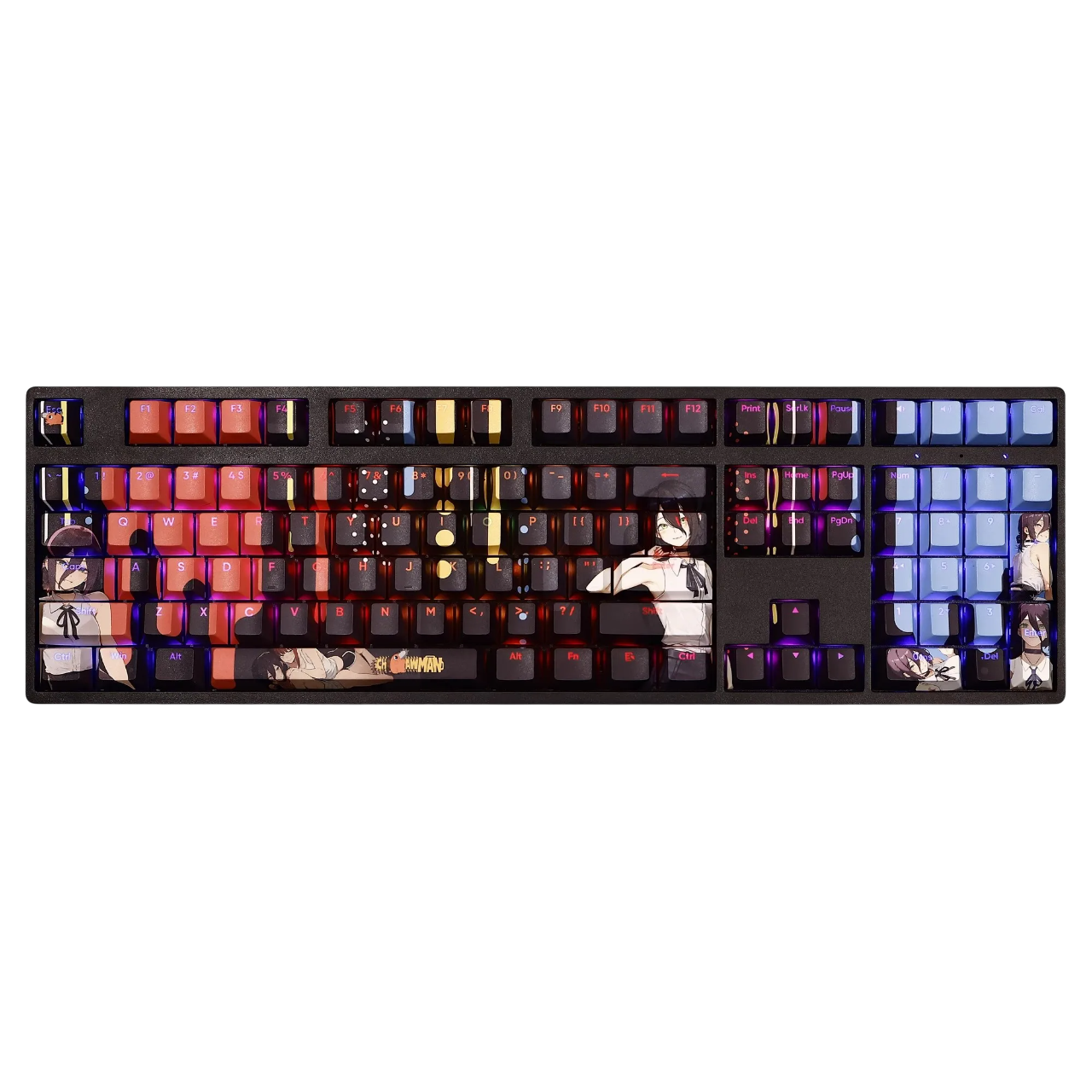 This mechanical keycaps set features various prints of Reze from the anime "Chainsaw Man" that are bound together with black, red and blue colouring, combined with Backlit keycaps, Reze illuminates when LEDs pass through the keycaps.