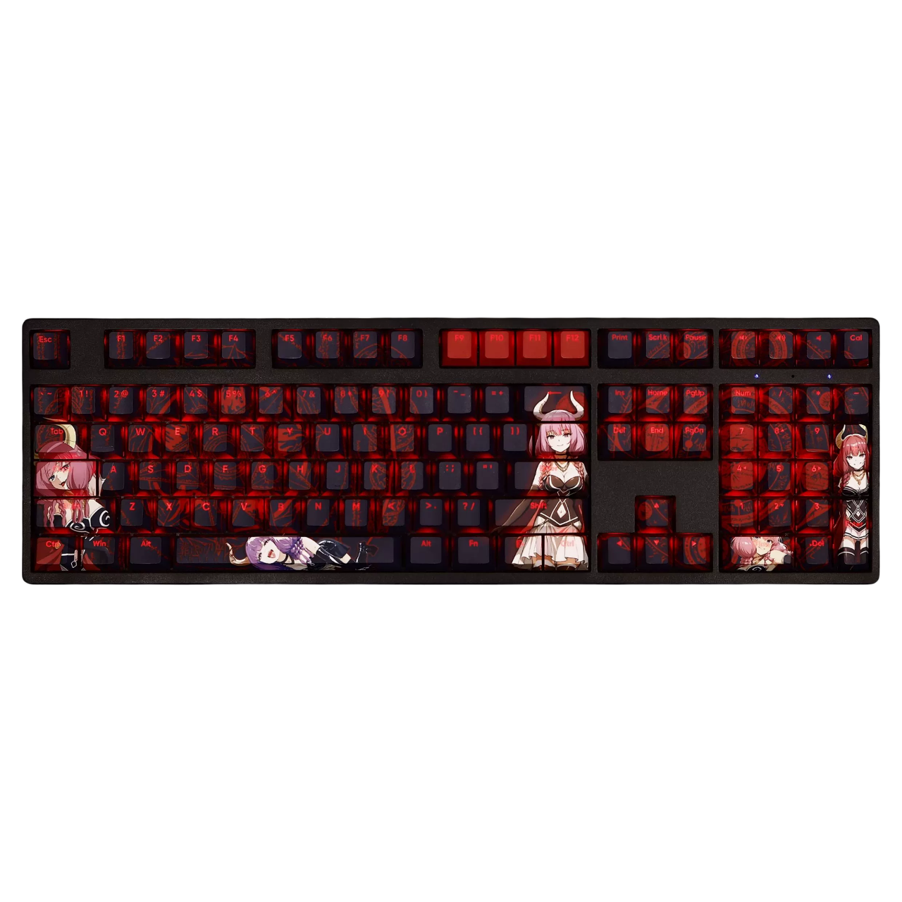 This mechanical keycaps set features various prints of Aura from the anime "Frieren" that are bound together with Red and Black colouring, combined with Backlit keycaps, Aura illuminates when LEDs pass through the keycaps.