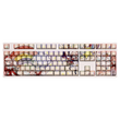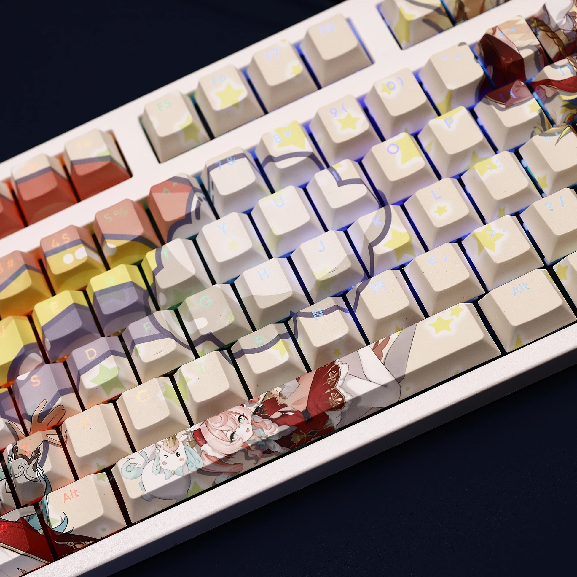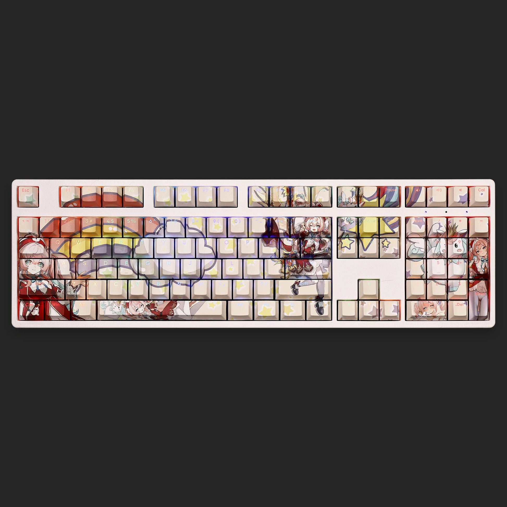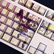 This mechanical keycaps set features various prints of Hyacine from the Game "Honkai" that are bound together with cream and orange colouring, combined with Backlit keycaps, Hyacine illuminates when LEDs pass through the keycaps.