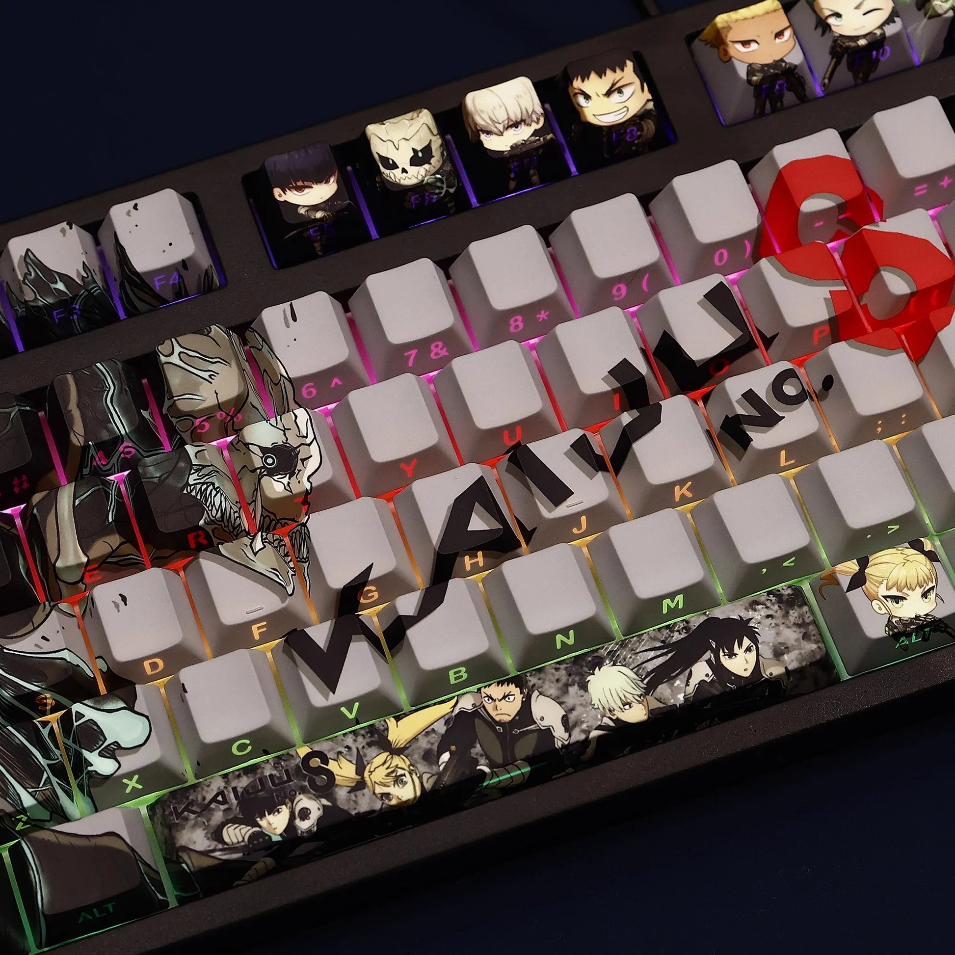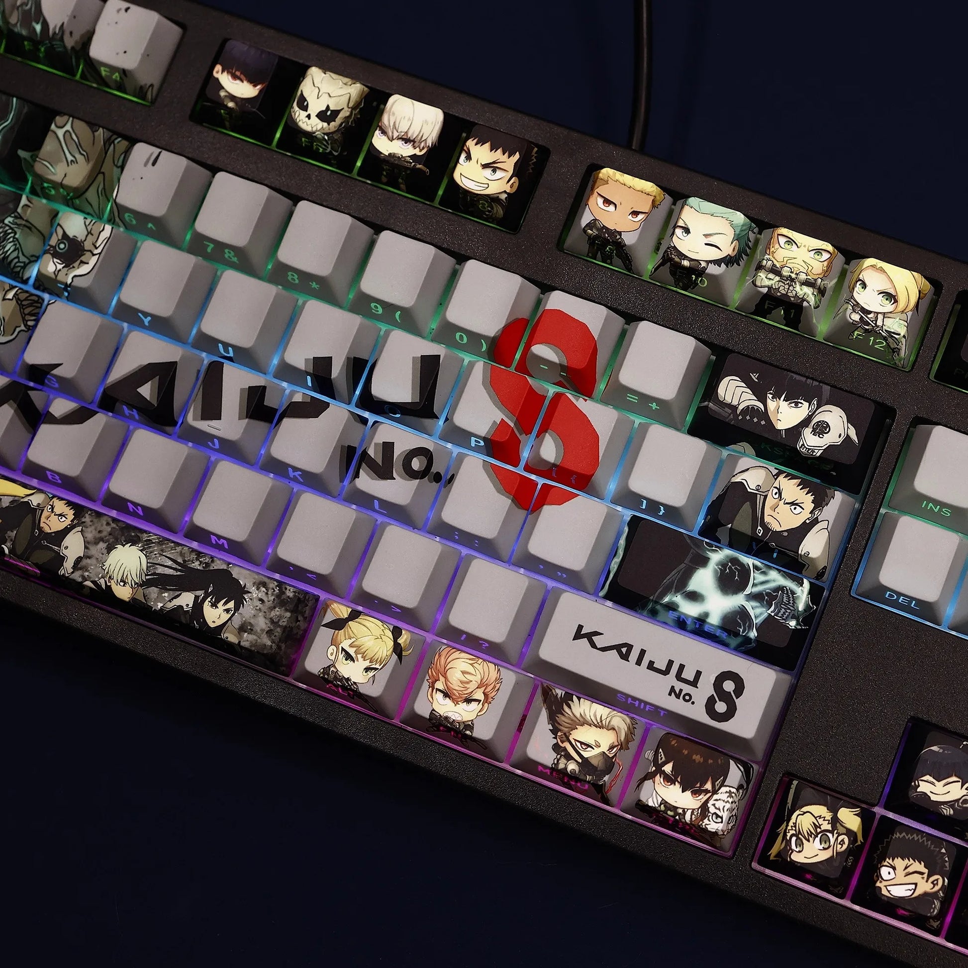 This mechanical keycaps set features various prints of characters from the anime "Kaiju No.8", that are bound together with black and white colouring, combined with Backlit keycaps, the characters illuminate when LEDs pass through the keycaps.