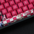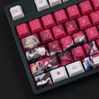 This mechanical keycaps set features various prints of Rita Rossweisse from the Game "Honkai" that are bound together with pink and white colouring.