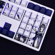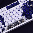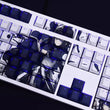 This mechanical keycaps set features various prints from the Game "The Hungry Lamb: Traveling in the Late Ming Dynasty" that are bound together with blue and white colouring, combined with Backlit keycaps, the characters illuminate when LEDs pass through the keycaps.