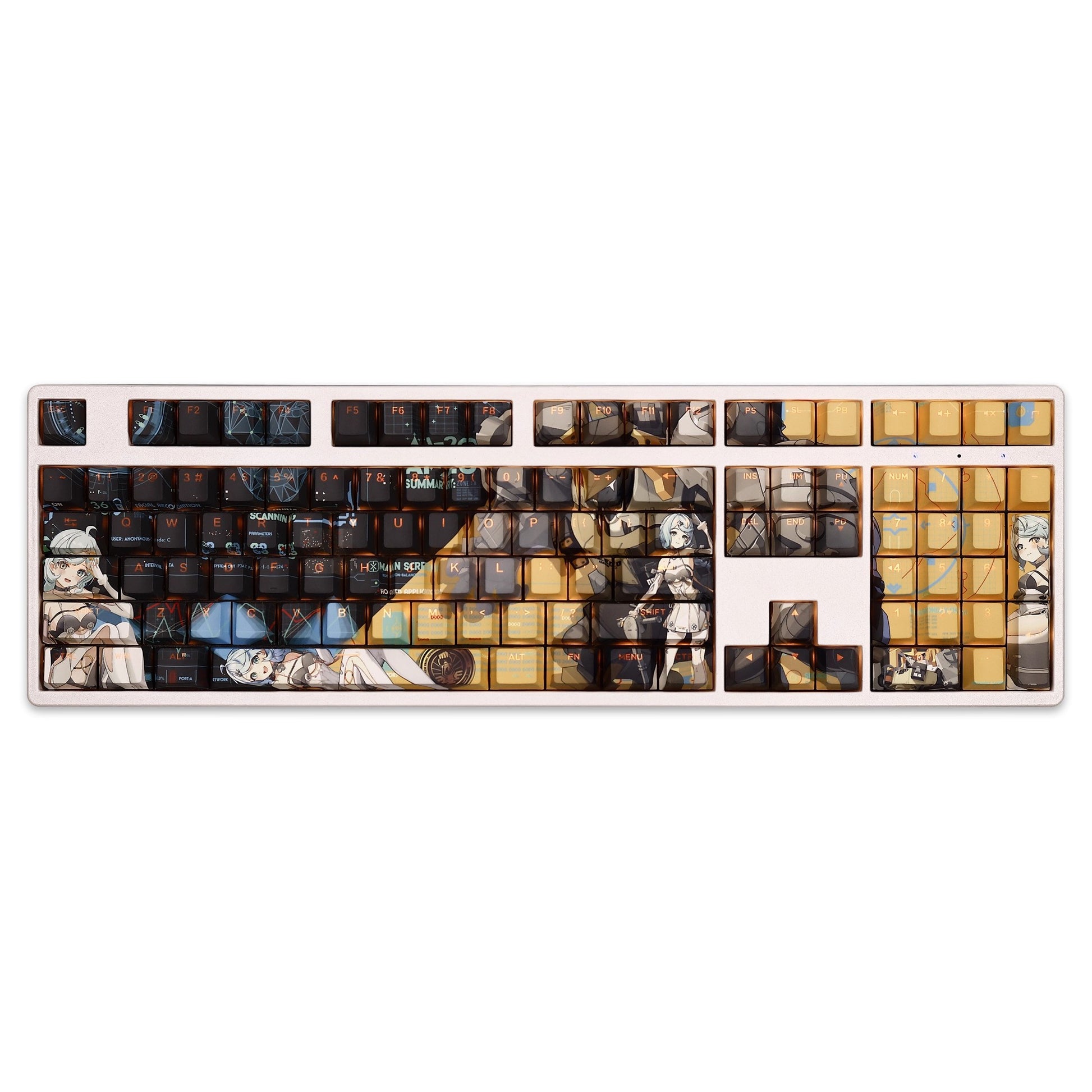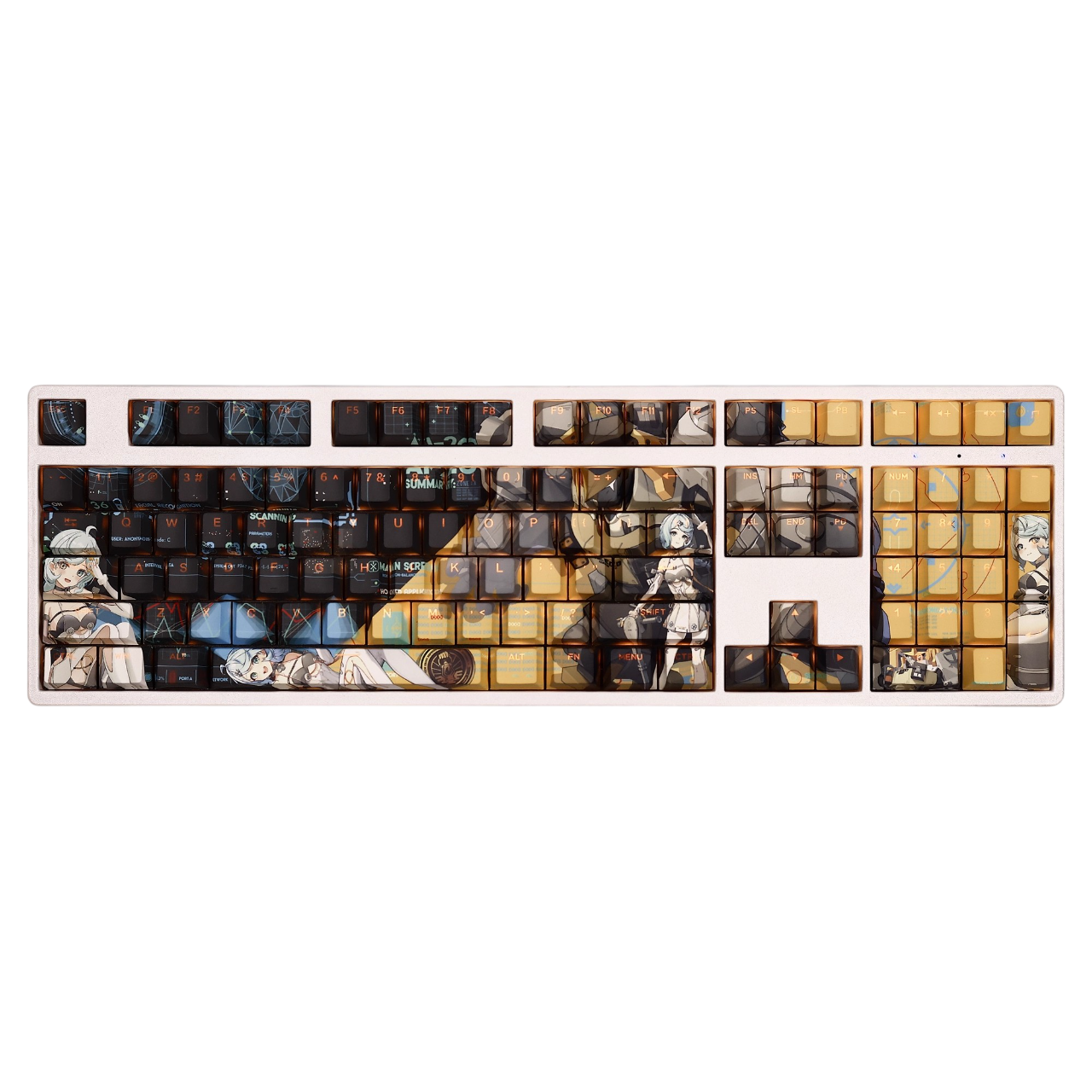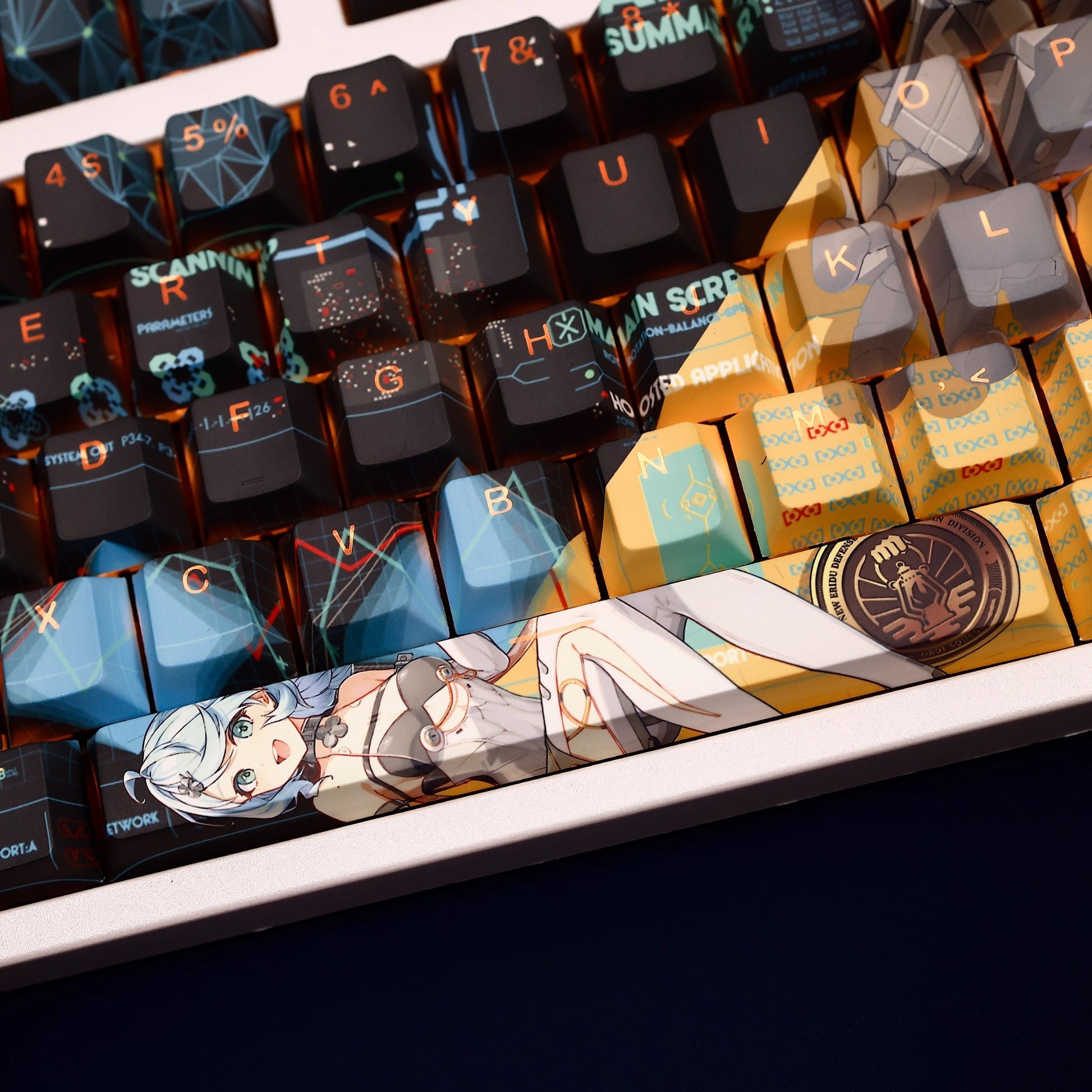 This mechanical keycaps set features various prints of Seed from the Game "Zenless Zone Zero" that are bound together with black and yellow colouring, combined with Backlit keycaps, Seed illuminates when LEDs pass through the keycaps.