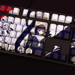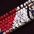 This mechanical keycaps set features various prints of characters from the anime "Girls Band Cry", that are bound together with red, white and blue colouring, combined with Backlit keycaps, the characters illuminate when LEDs pass through the keycaps.
