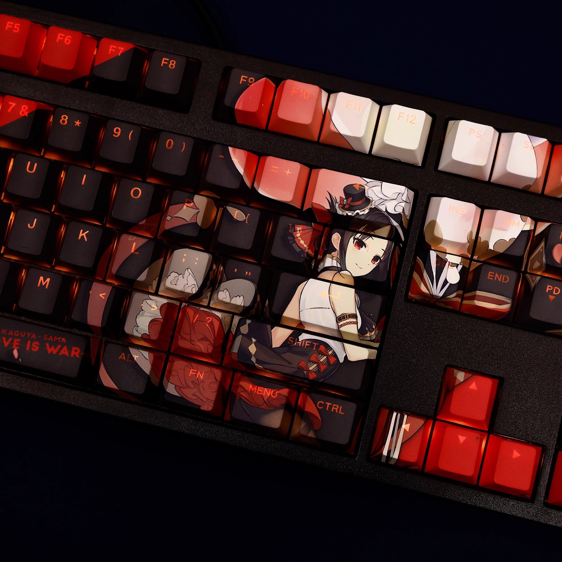 This mechanical keycaps set features various prints of Kaguya Shinomiya from the anime "Kaguya-sama" that are bound together with white and red colouring, combined with Backlit keycaps, Kaguya Shinomiya illuminates when LEDs pass through the keycaps.