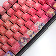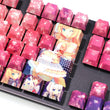This mechanical keycaps set features various prints of characters from the anime "Nekopara" that are bound together with pink and purple colouring.