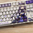 This mechanical keycaps set features various prints of Keqing from the game "Genshin Impact" that are bound together with white and purple colouring.