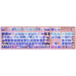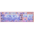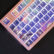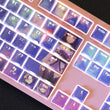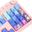 This mechanical keycaps set features various prints of Raiden Shogun from the Game "Genshin Impact" that are bound together with blue colouring, combined with Backlit keycaps, Raiden Shogun illuminates when LEDs pass through the keycaps.