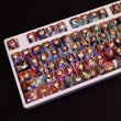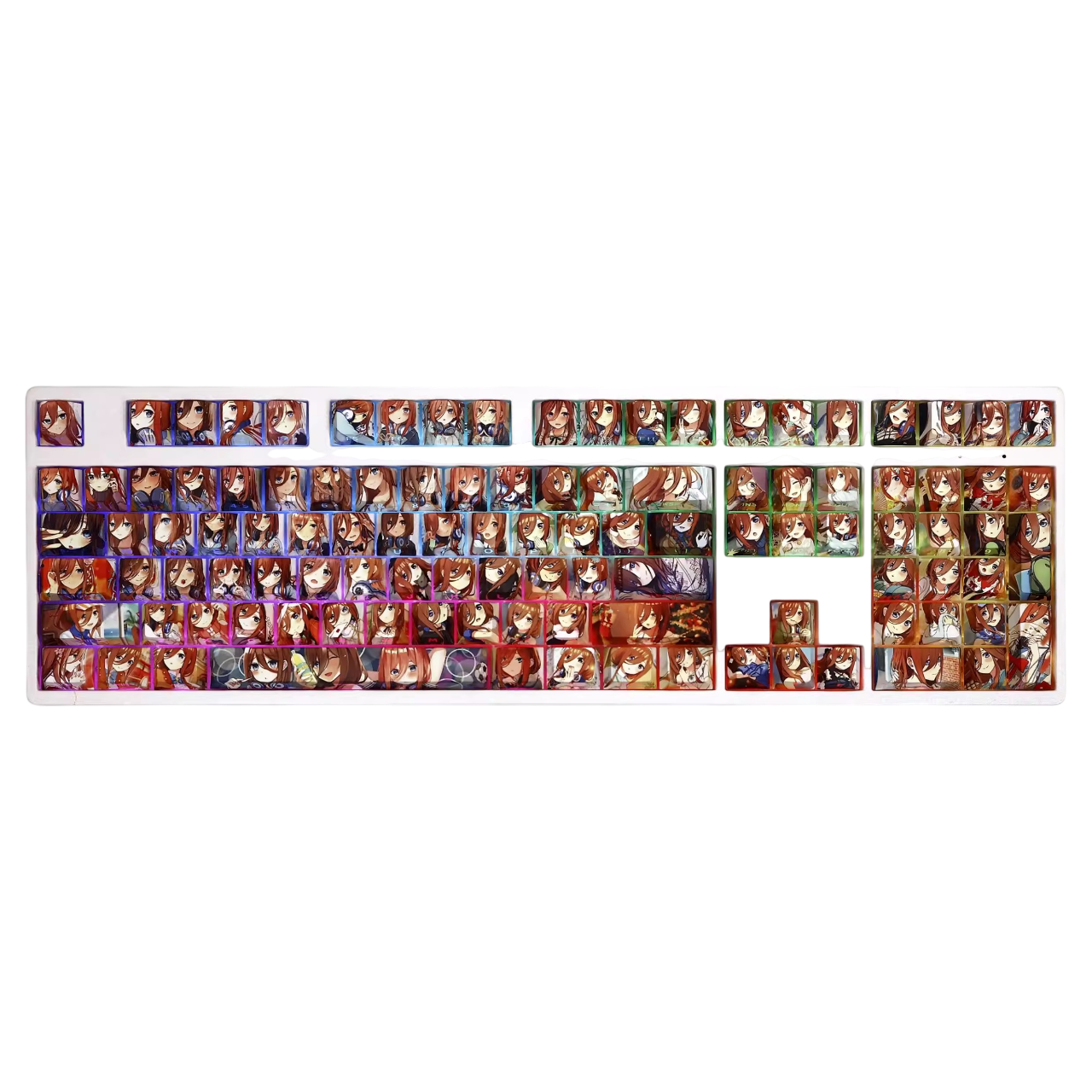 This mechanical keycaps set features various prints of faces from the anime "The Quintessential Quintuplets" that are bound together with pink colouring, combined with Backlit keycaps, the faces illuminates when LEDs pass through the keycaps