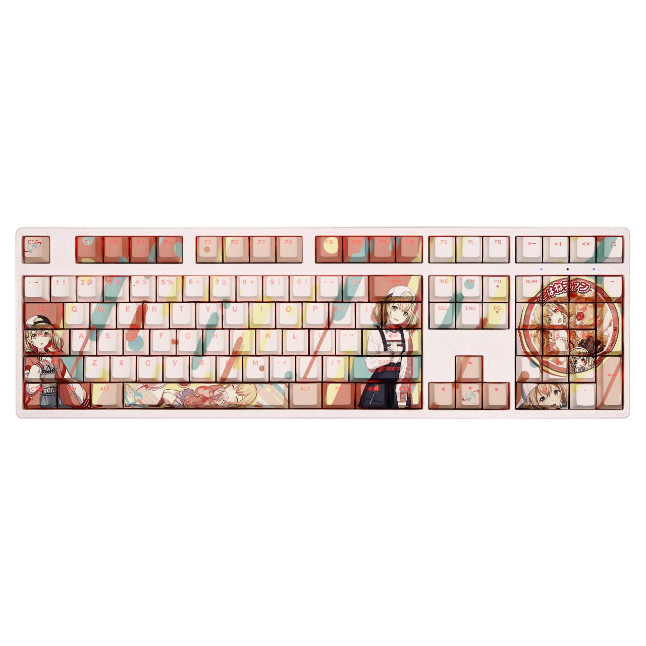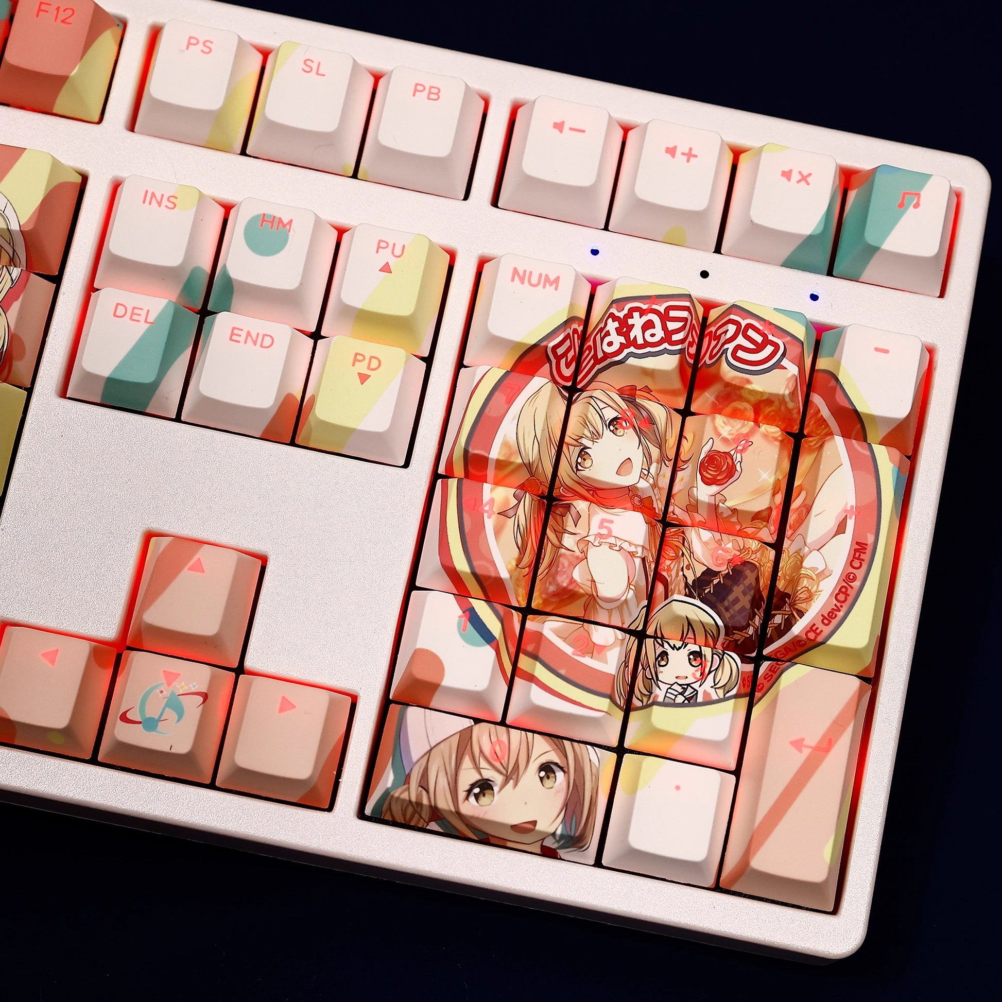 This mechanical keycaps set features various prints of Azusawa Kohane from the game "Project SEKAI" that are bound together with white and brown colouring, combined with Backlit keycaps, Azusawa Kohane illuminates when LEDs pass through the keycaps.