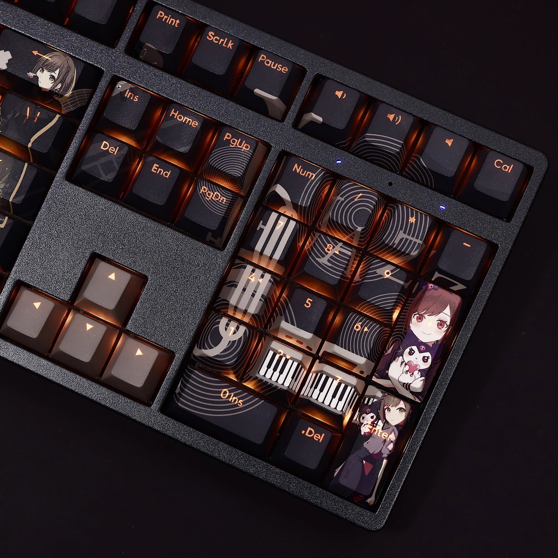 This mechanical keycaps set features various prints of Ena Shinonome from the game "Project SEKAI" that are bound together with black colouring, combined with Backlit keycaps, Ena Shinonome illuminates when LEDs pass through the keycaps.