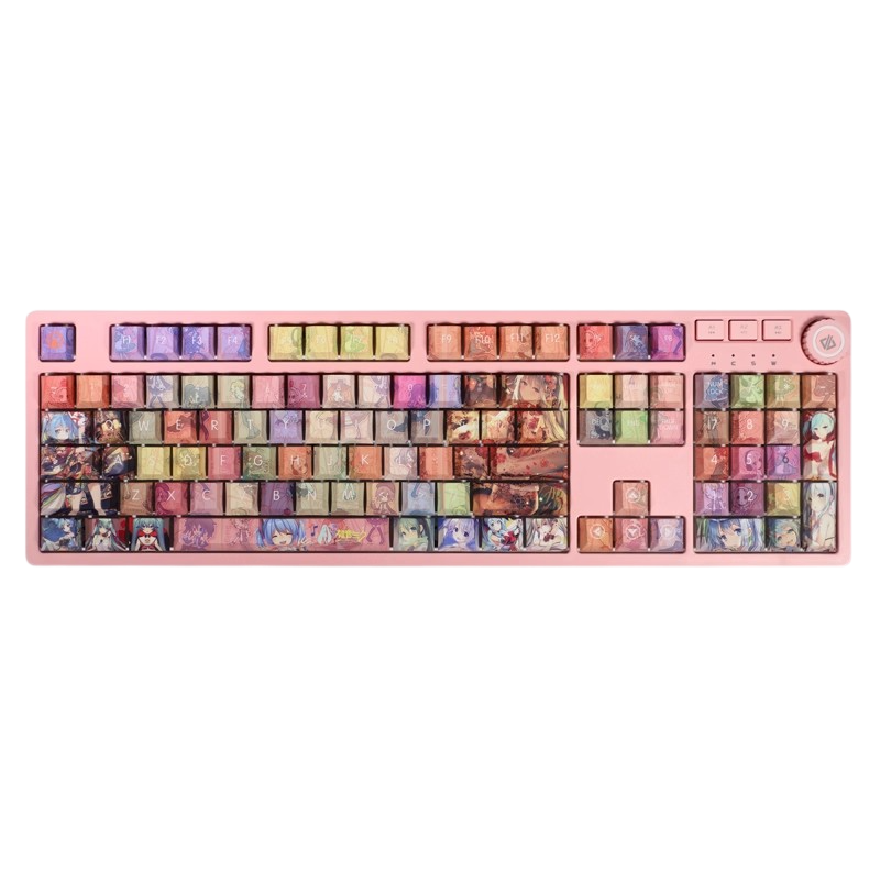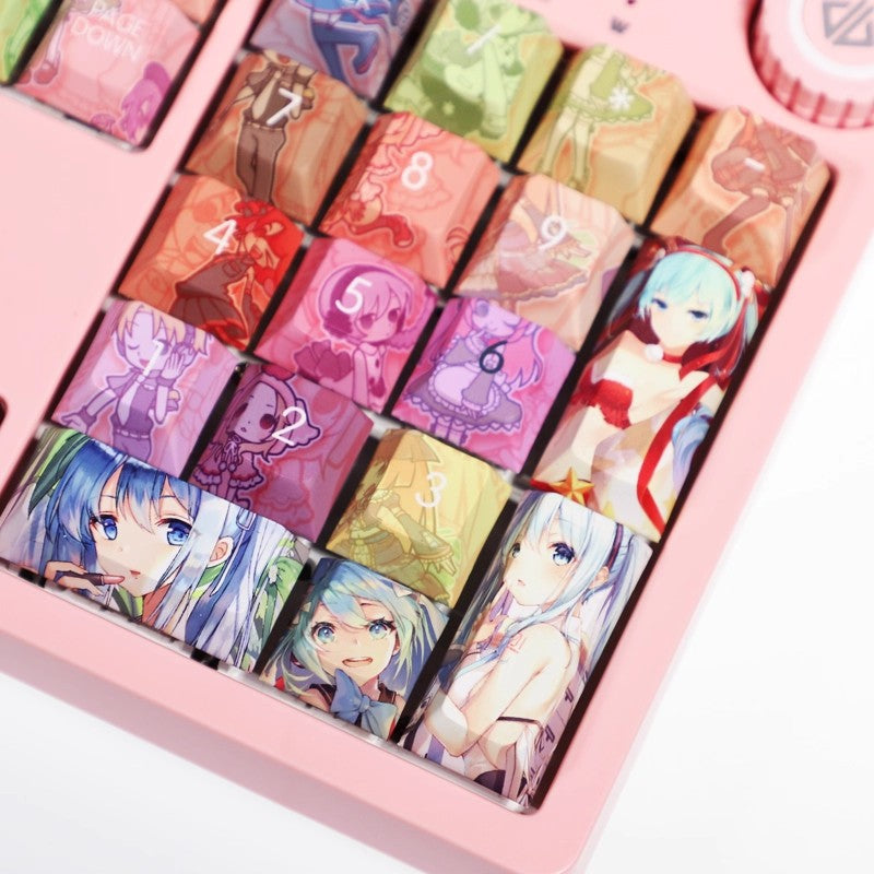 This mechanical keycaps set features various prints of Hatsune Miku from the game "Project SEKAI" that are bound together with rainbow colouring.