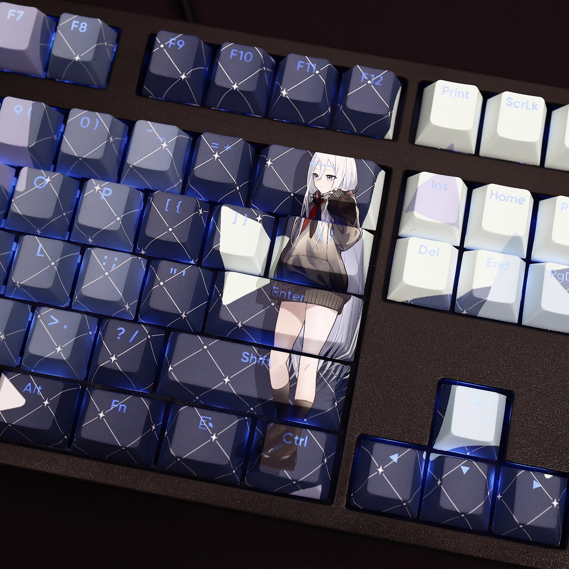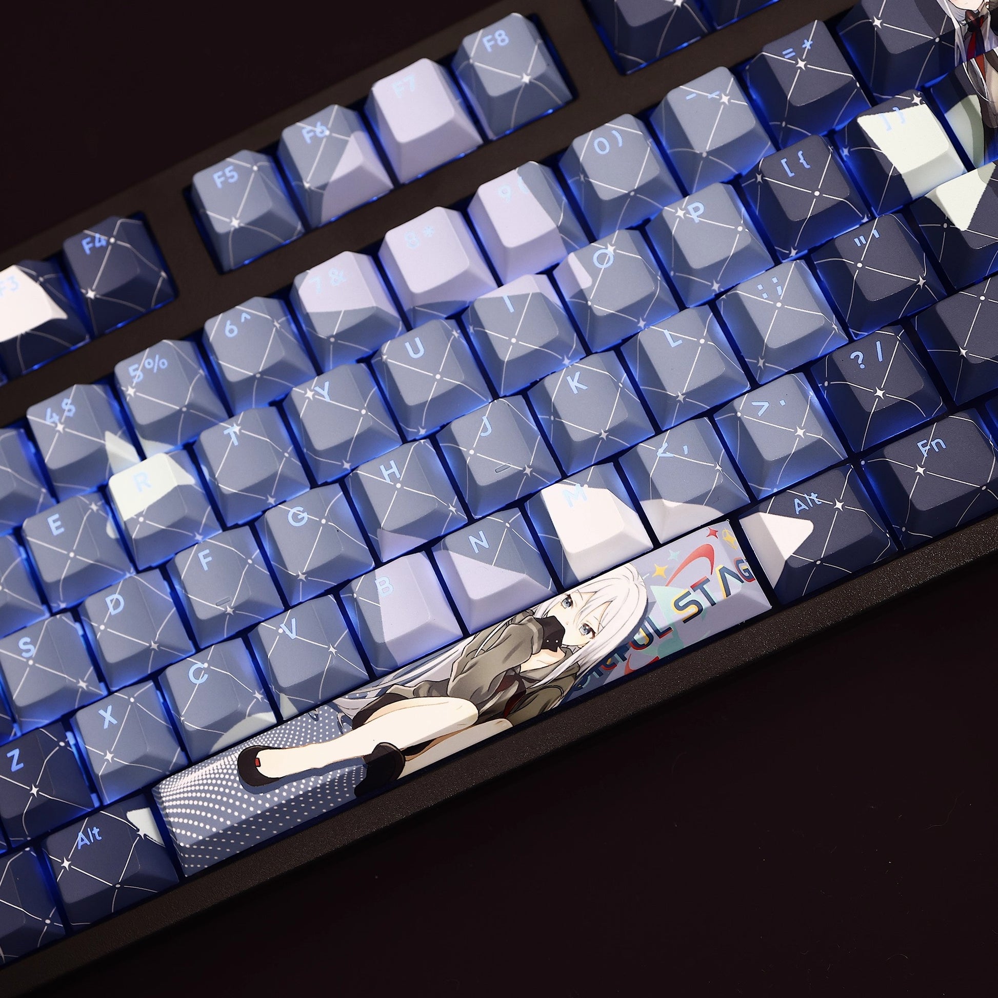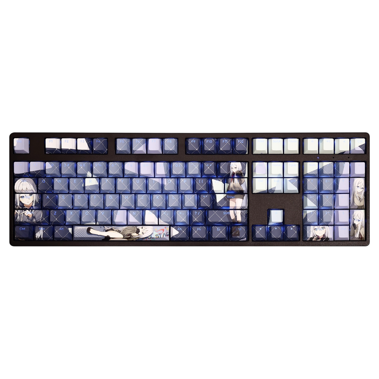 This mechanical keycaps set features various prints of Yoisaki Kanade from the game "Project SEKAI" that are bound together with blue and white colouring, combined with Backlit keycaps, Yoisaki Kanade illuminates when LEDs pass through the keycaps.