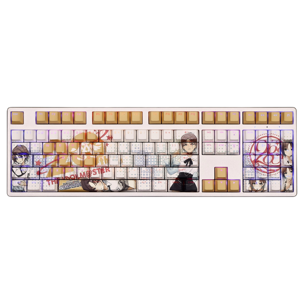 This mechanical keycaps set features various prints of Toru Asakura from the game "The iDOLM@STER" that are bound together with white and yellow colouring, combined with Backlit keycaps, Toru Asakura illuminates when LEDs pass through the keycaps.