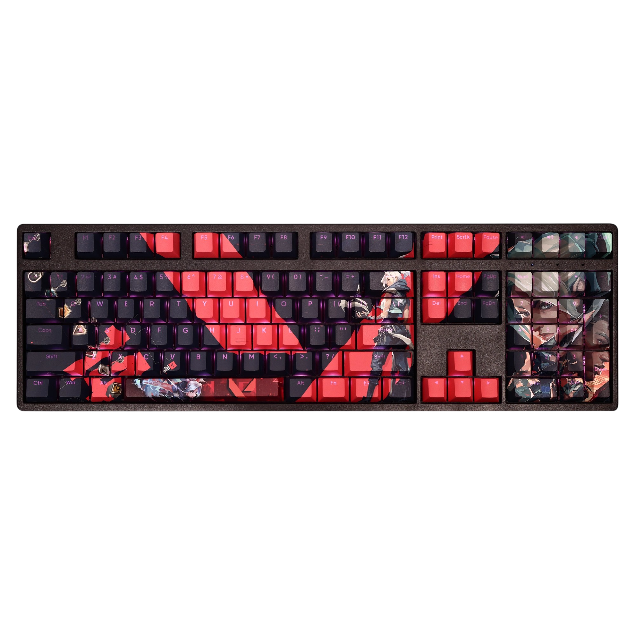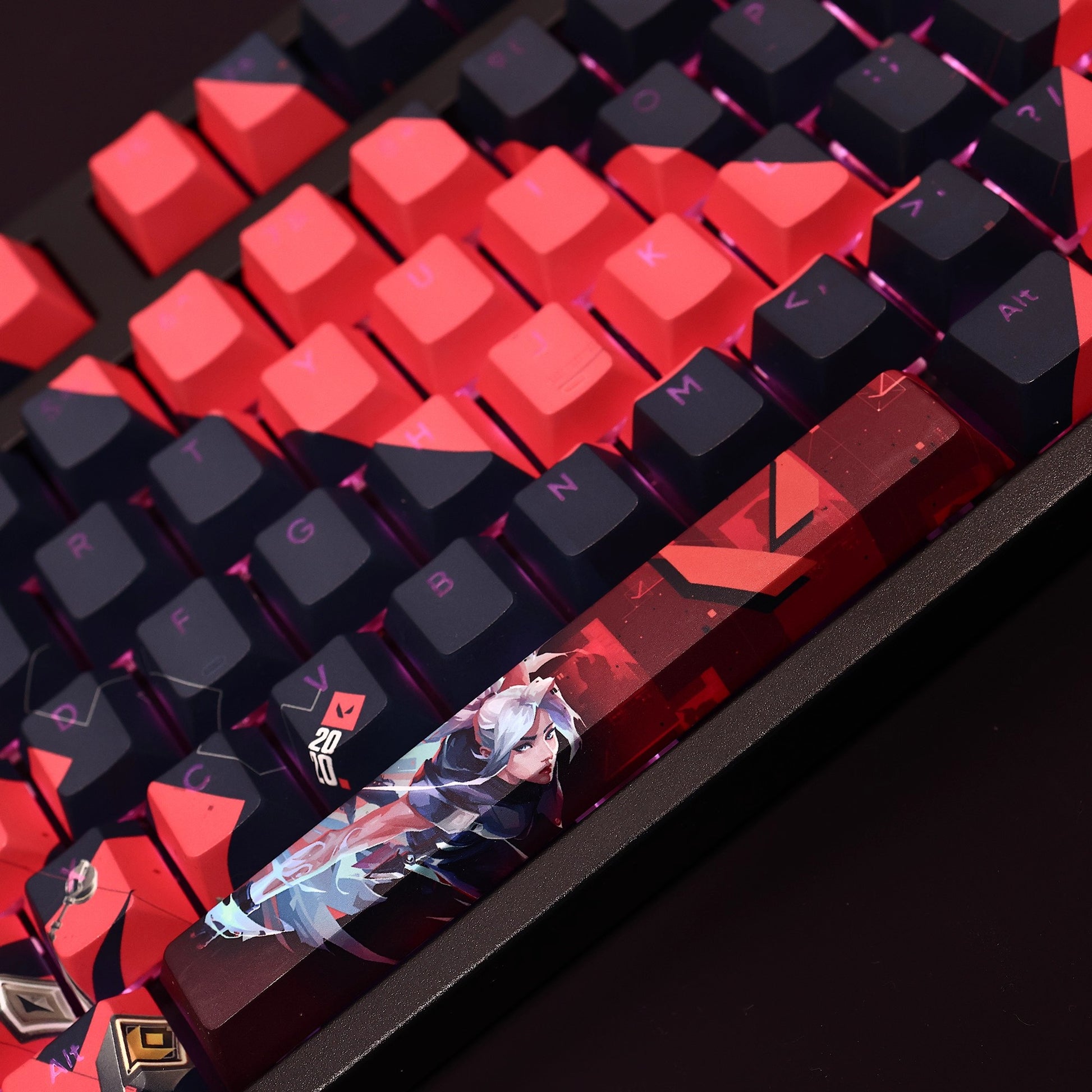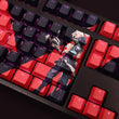 This mechanical keycaps set features various prints of Jett from the Game "Valorant" that are bound together with black and red colouring, combined with Backlit keycaps, Jett illuminates when LEDs pass through the keycaps.