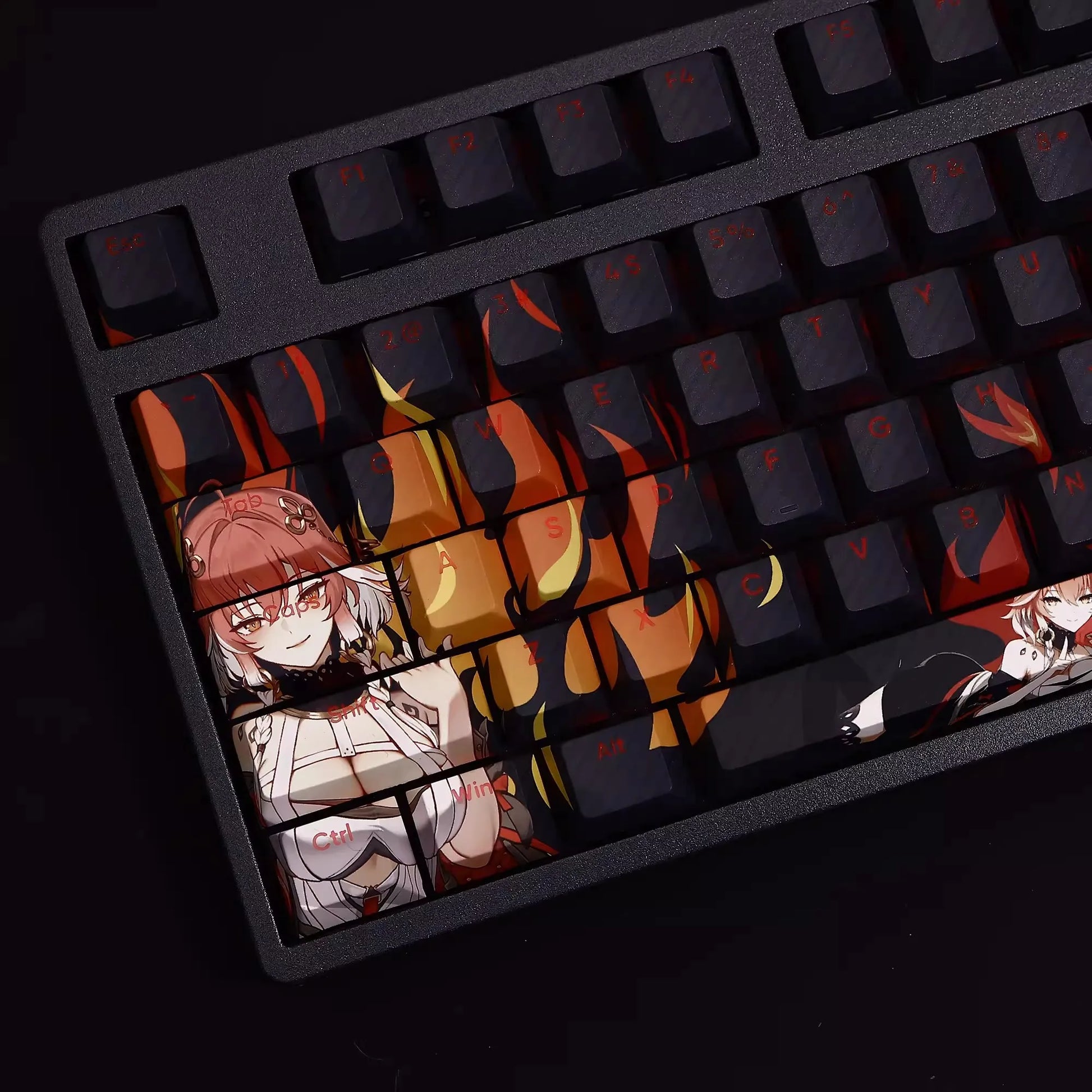 This mechanical keycaps set features various prints of Changli from the game "Wuthering Waves" that are bound together with black and red colouring.