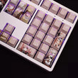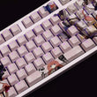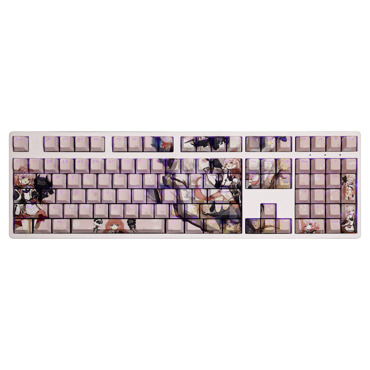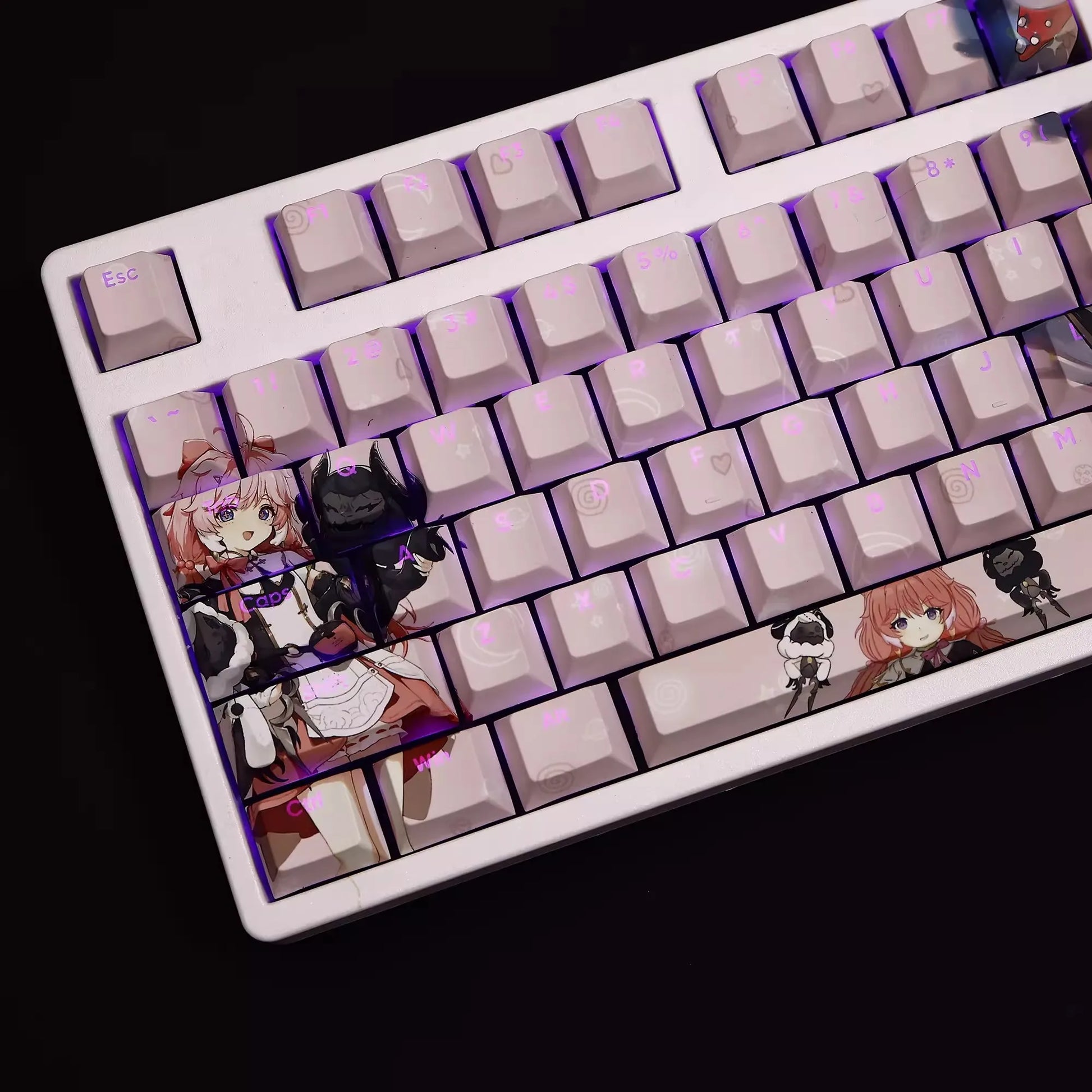 This mechanical keycaps set features various prints of Encore from the Game "Wuthering Waves" that are bound together with light pink colouring, combined with Backlit keycaps, Encore illuminates when LEDs pass through the keycaps.