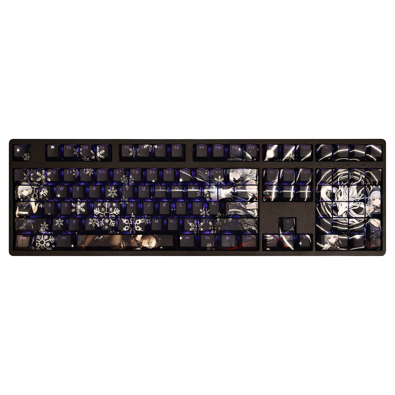 This mechanical keycaps set features various prints of Sanhua from the Game "Wuthering Waves" that are bound together with black colouring, combined with Backlit keycaps, Sanhua illuminates when LEDs pass through the keycaps.