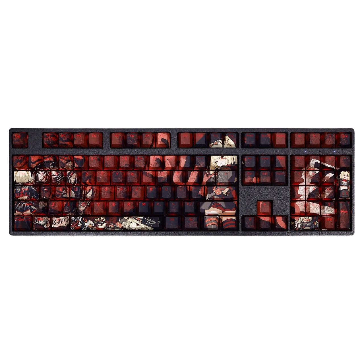 This mechanical keycaps set features various prints of Burnice from the Game "Zenless Zone Zero" that are bound together with red and black colouring, combined with Backlit keycaps, Burnice illuminates when LEDs pass through the keycaps.