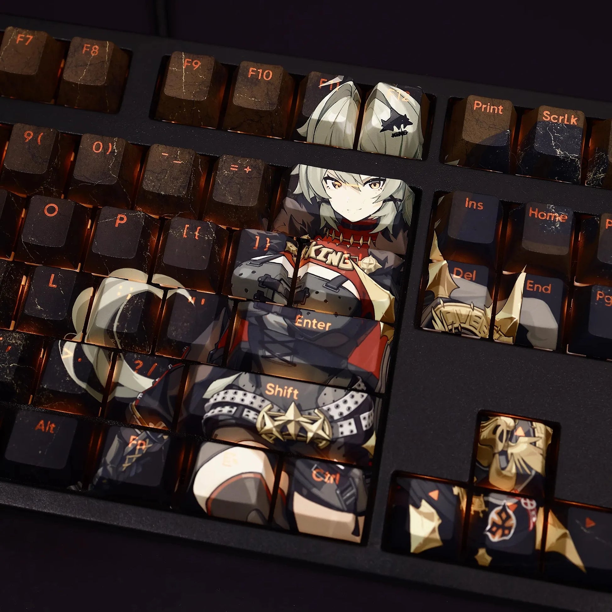 This mechanical keycaps set features various prints of Caesar King from the Game "Zenless Zone Zero" that are bound together with black and orange colouring, combined with Backlit keycaps, Caesar King illuminates when LEDs pass through the keycaps.