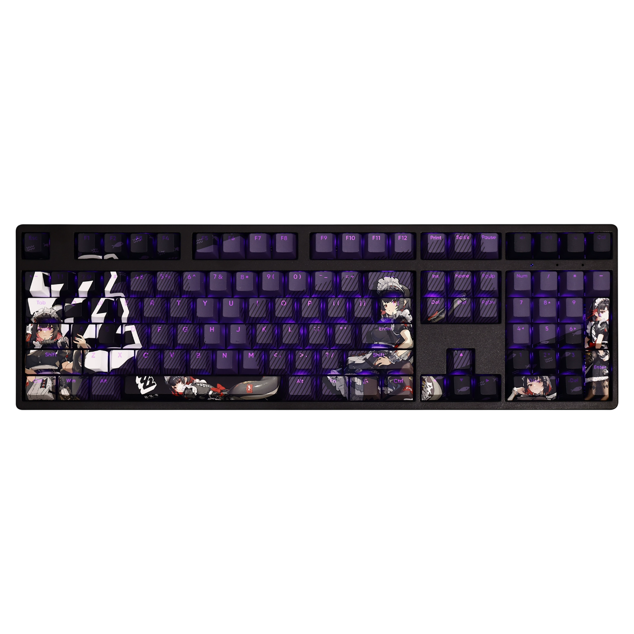 This mechanical keycaps set features various prints of Ellen Joe from the Game "Zenless Zone Zero" that are bound together with purple and black colouring, combined with Backlit keycaps, Ellen Joe illuminates when LEDs pass through the keycaps.