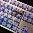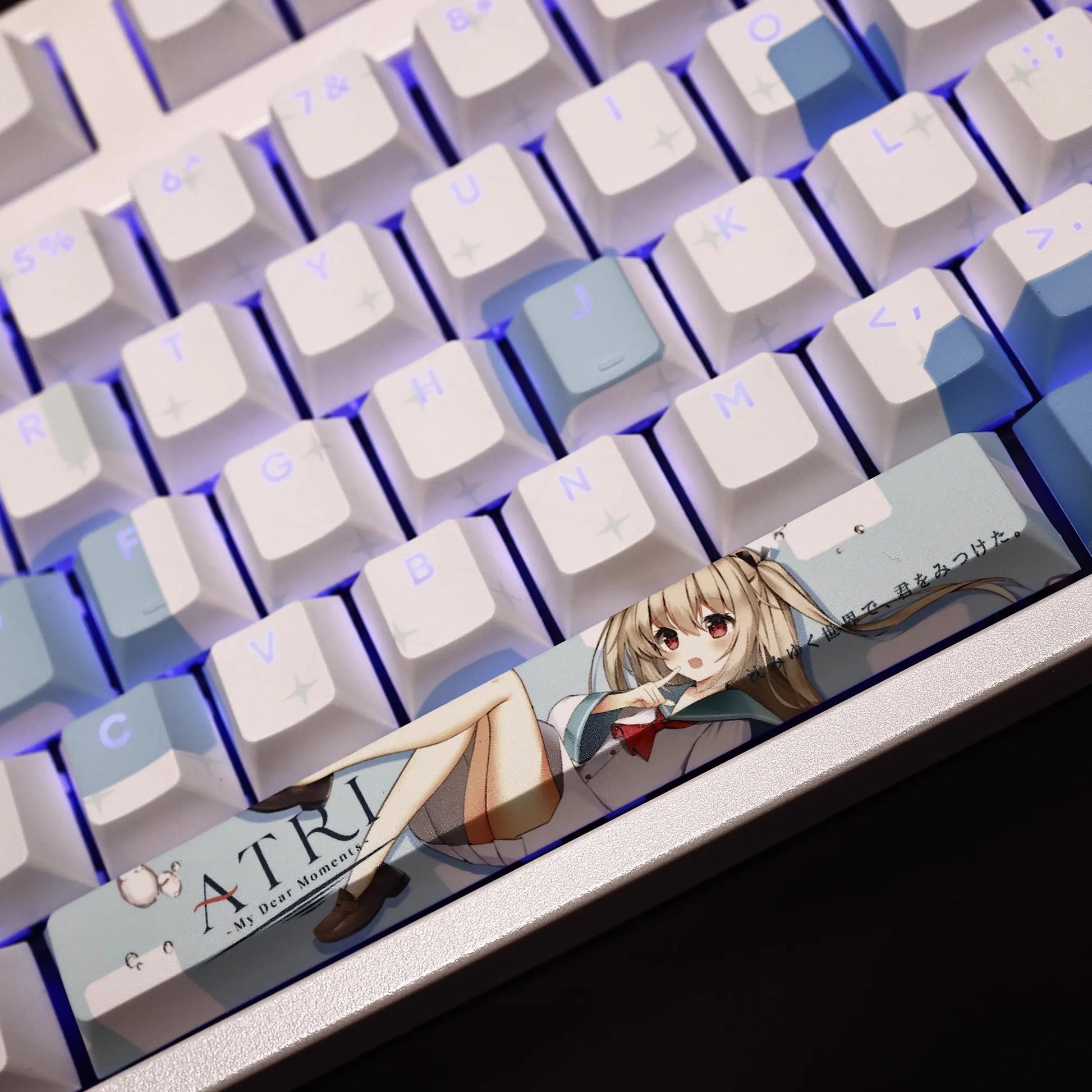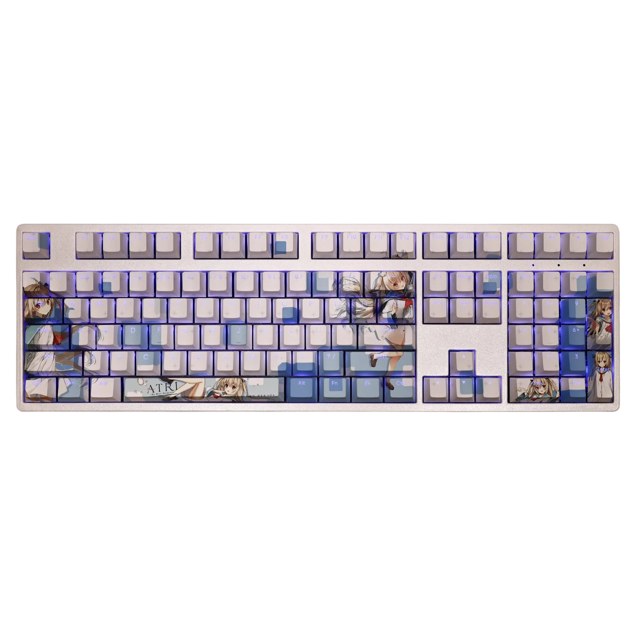 This mechanical keycaps set features various prints from the Game "Atri: My Dear Moments" that are bound together with blue and white colouring, combined with Backlit keycaps, the characters illuminate when LEDs pass through the keycaps.