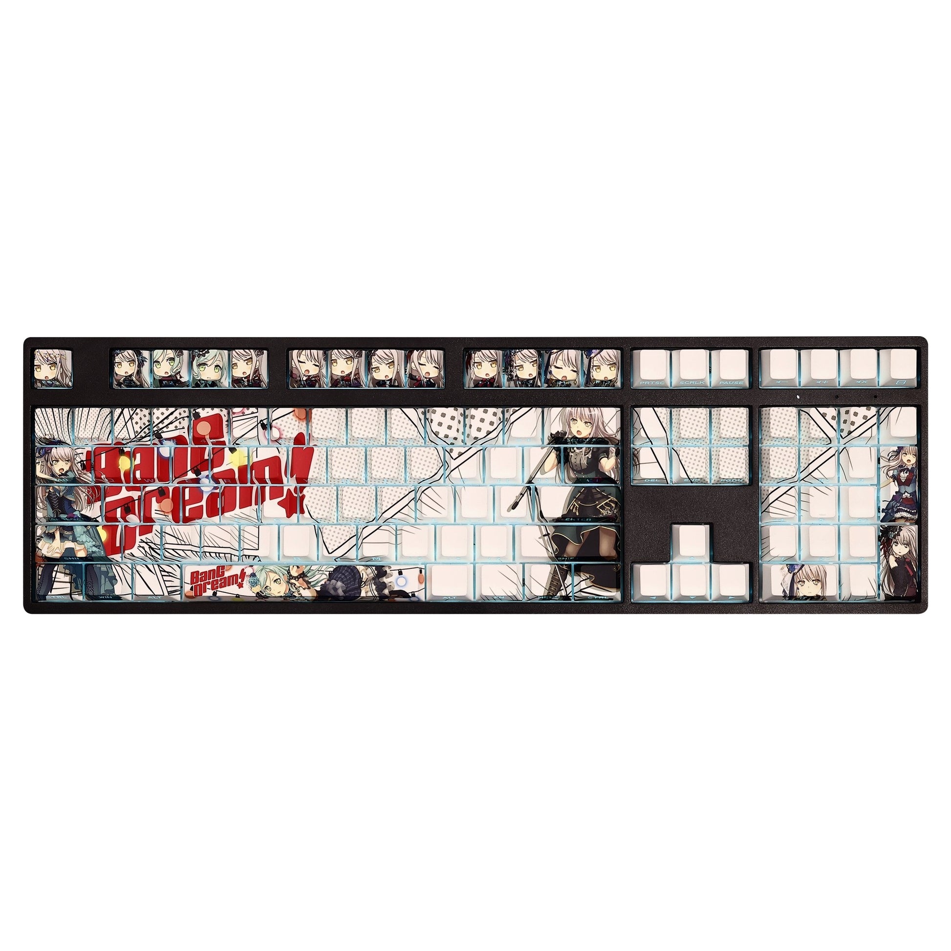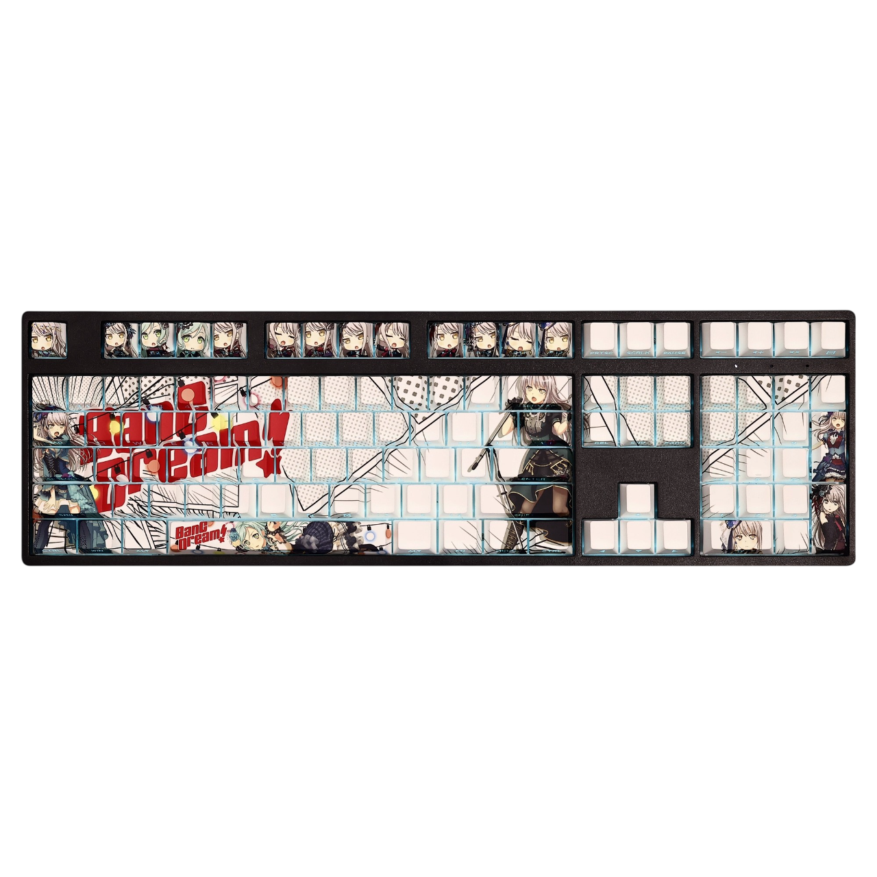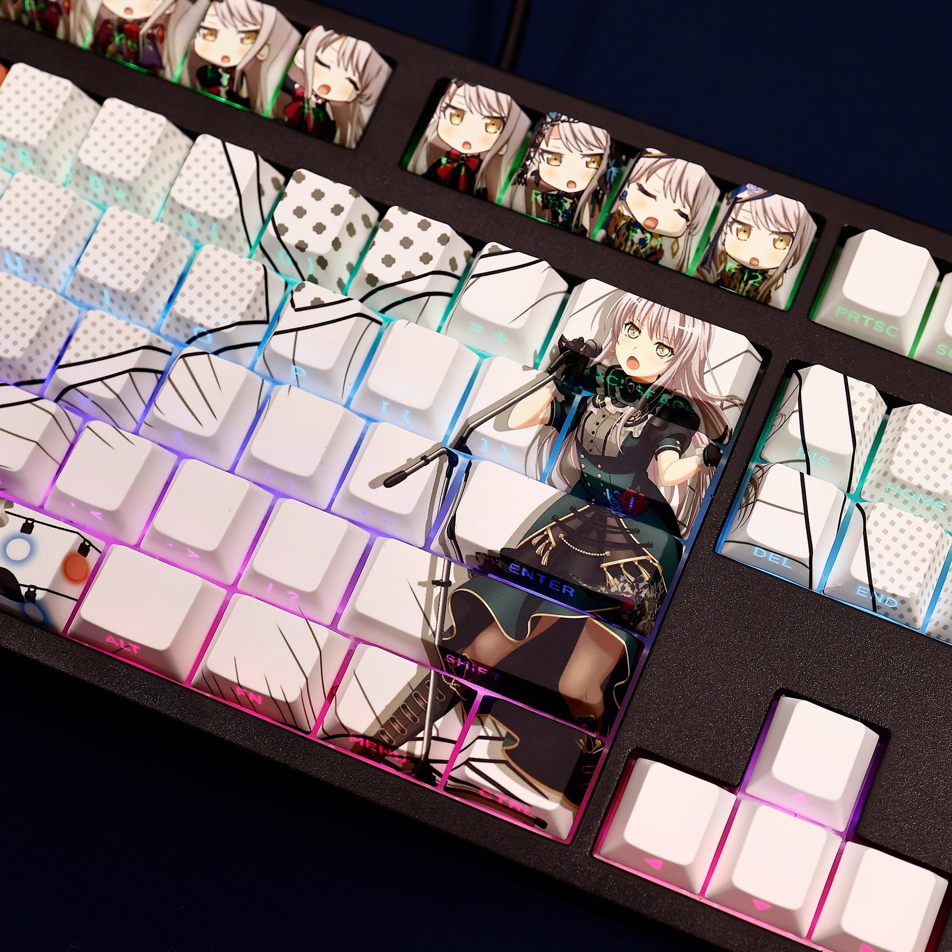 This mechanical keycaps set features various prints of Minato Yukina from the game "BanG Dream" that are bound together with white colouring, combined with Backlit keycaps, Minato Yukina illuminates when LEDs pass through the keycaps.