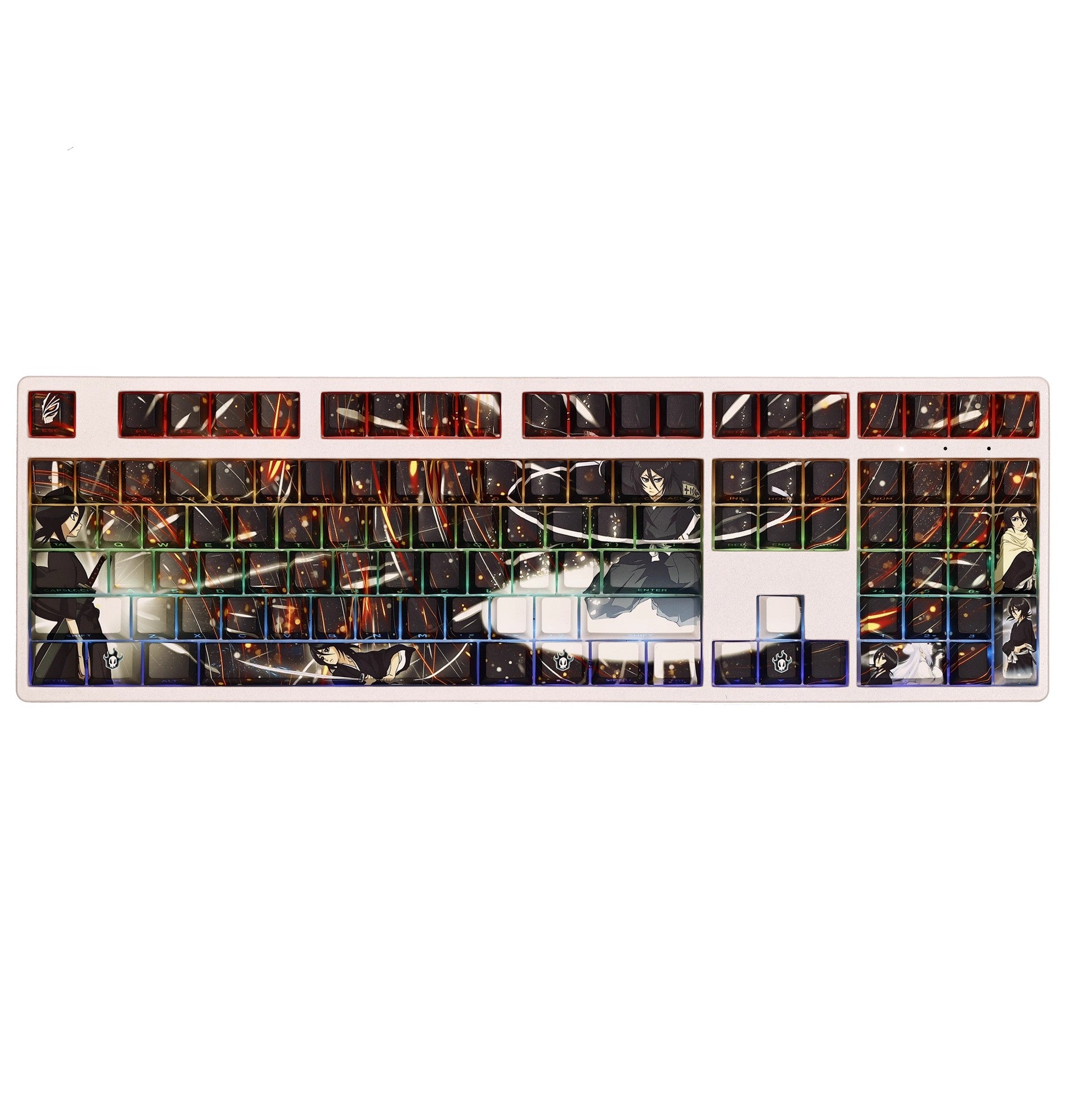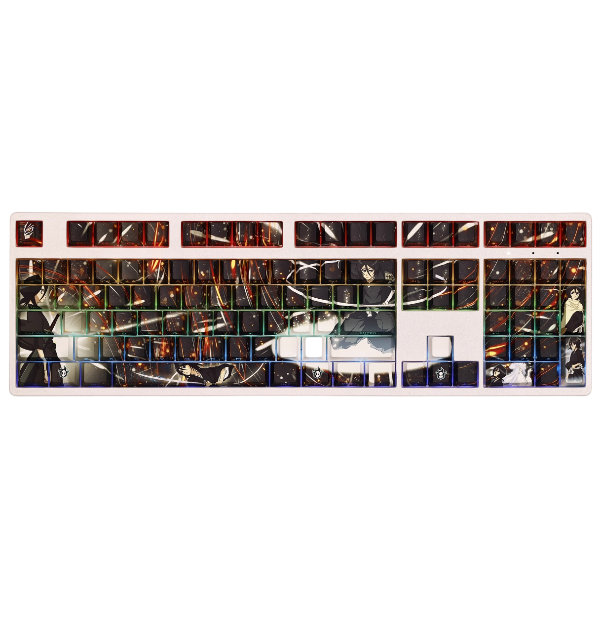 This mechanical keycaps set features various prints of Rukia Kuchiki from the anime "Bleach" that are bound together with black and white colouring, combined with Backlit keycaps, Rukia Kuchiki illuminates when LEDs pass through the keycaps.