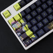 This mechanical keycaps set features various prints of Cyberpunk characters, the keyboard is bound together with black and yellow colouring.